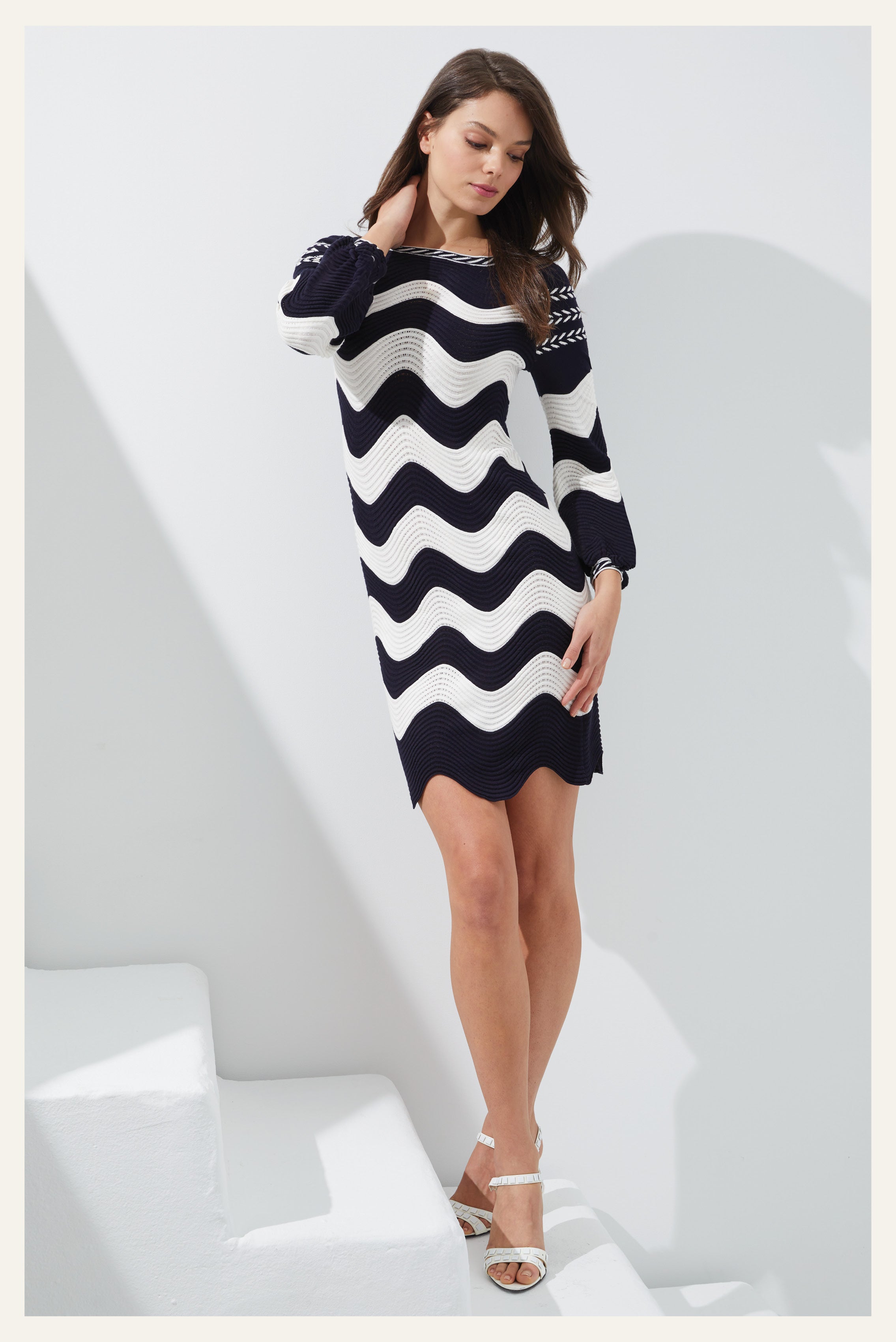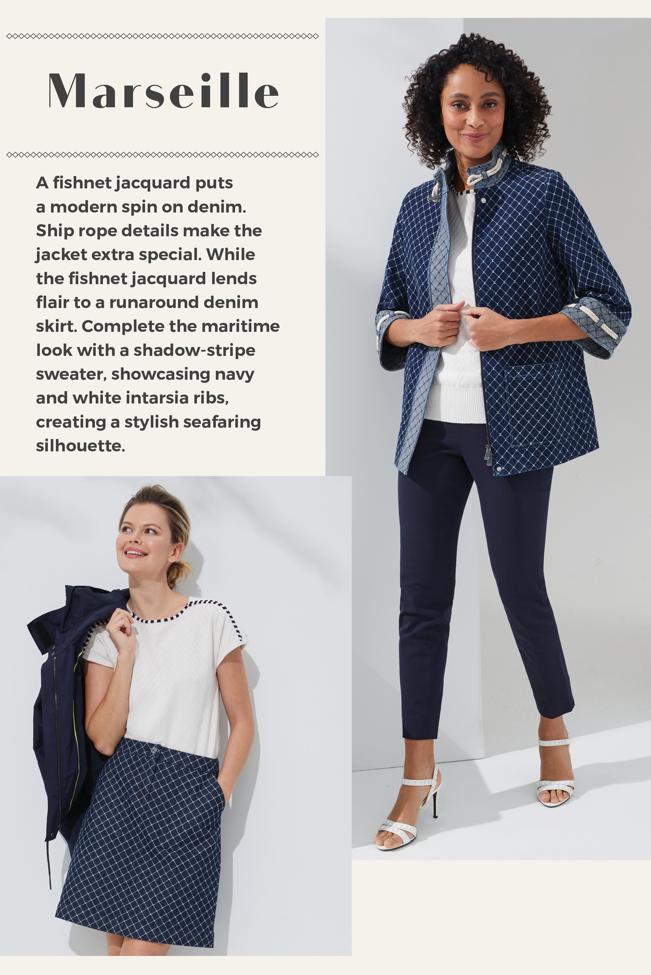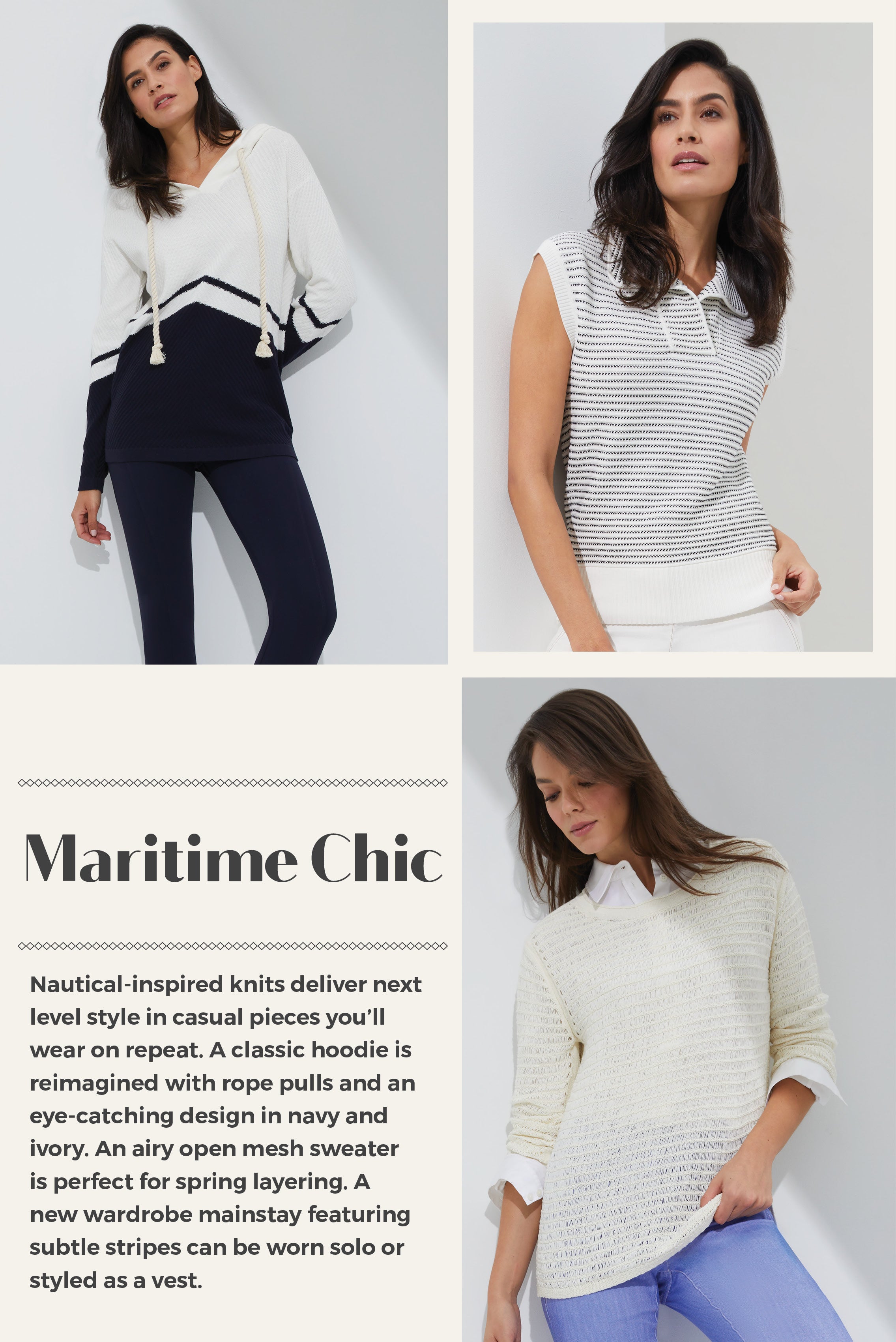 "These styles represent a voyage of the heart and soul, celebrating the timeless allure of the sea and the enduring romance of coastal living. With each ensemble, wearers embark on their own seaside adventure, capturing the magic of the ocean and the yearning for limitless horizons. Picture a woman standing in front of the vastness of the sea with romantic longing in her heart. She travels the globe in search of the perfect shoreline experience wearing nautical fashions that evoke the allure of a coastal romance. Incorporating elements of yachting culture and nautical terms, this shipshape collection called La Mer reimagines classic styles with a fresh and contemporary twist. Striped knits and hoodies embody the casual elegance of a day on deck, while jazzy jacquards and romantic prints mirror the whimsy and nostalgia of seaside escapes. Lounge-friendly silhouettes and fabrics invite comfort and relaxation, reminiscent of lazy days by the shore. The limpid clarity of the palette echoes the tranquil beauty of the sea, capturing the watery source of inspiration in each look. The enchanting Debussy orchestral piece La Mer serves as the collection's soundtrack, echoing the fluidity and grace of every piece."