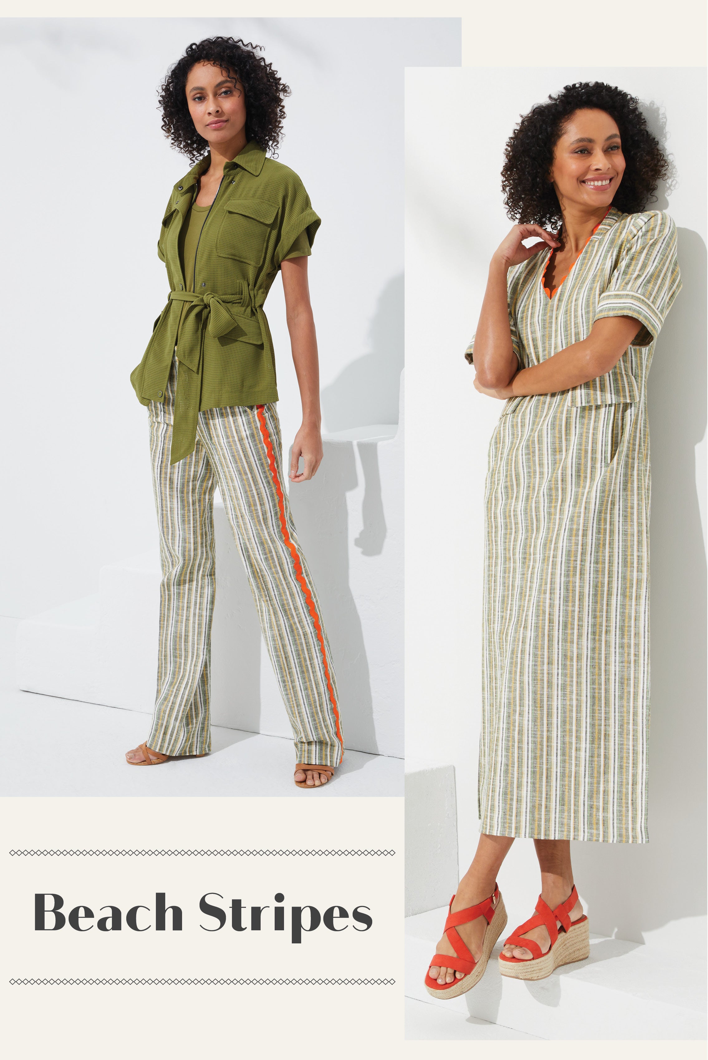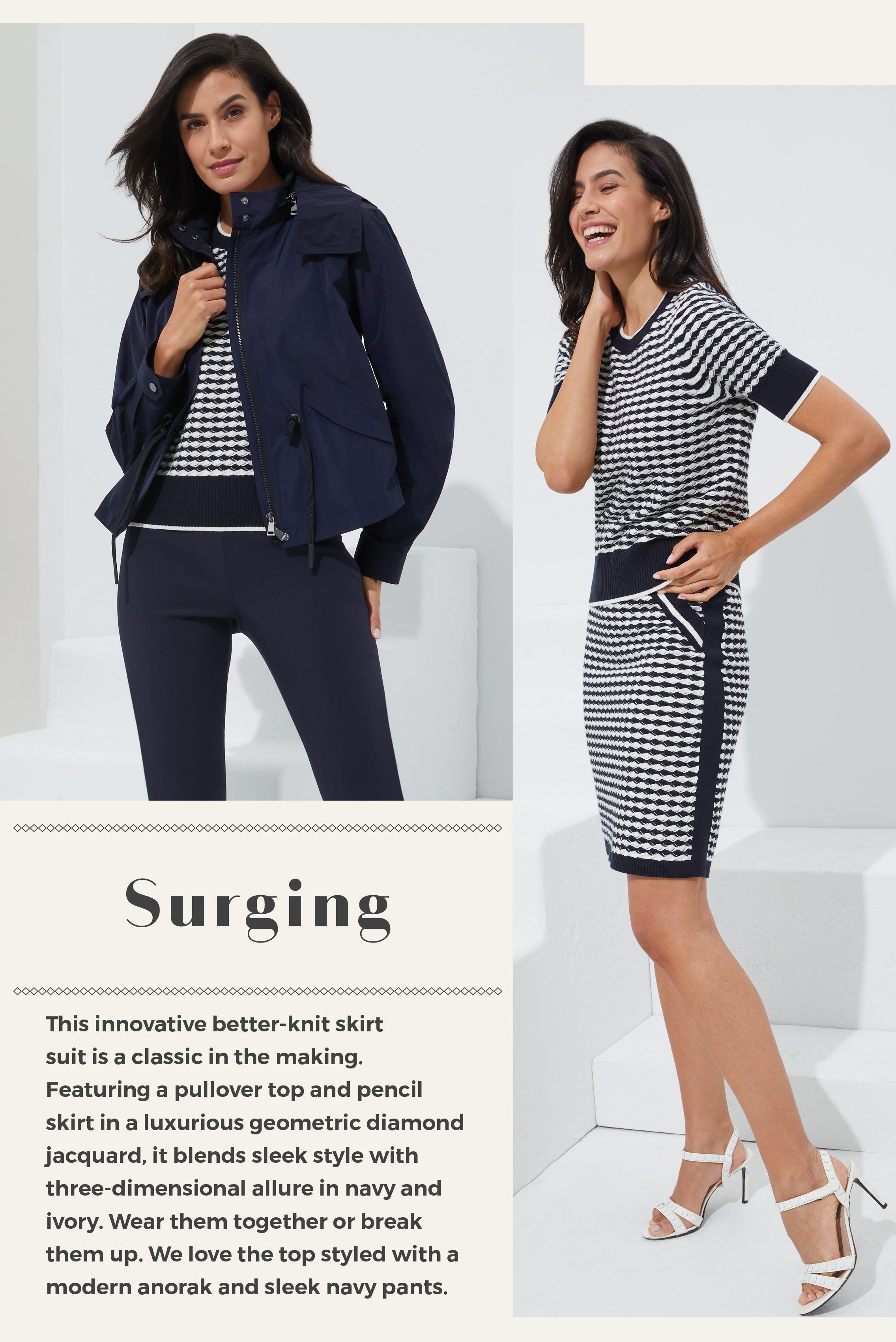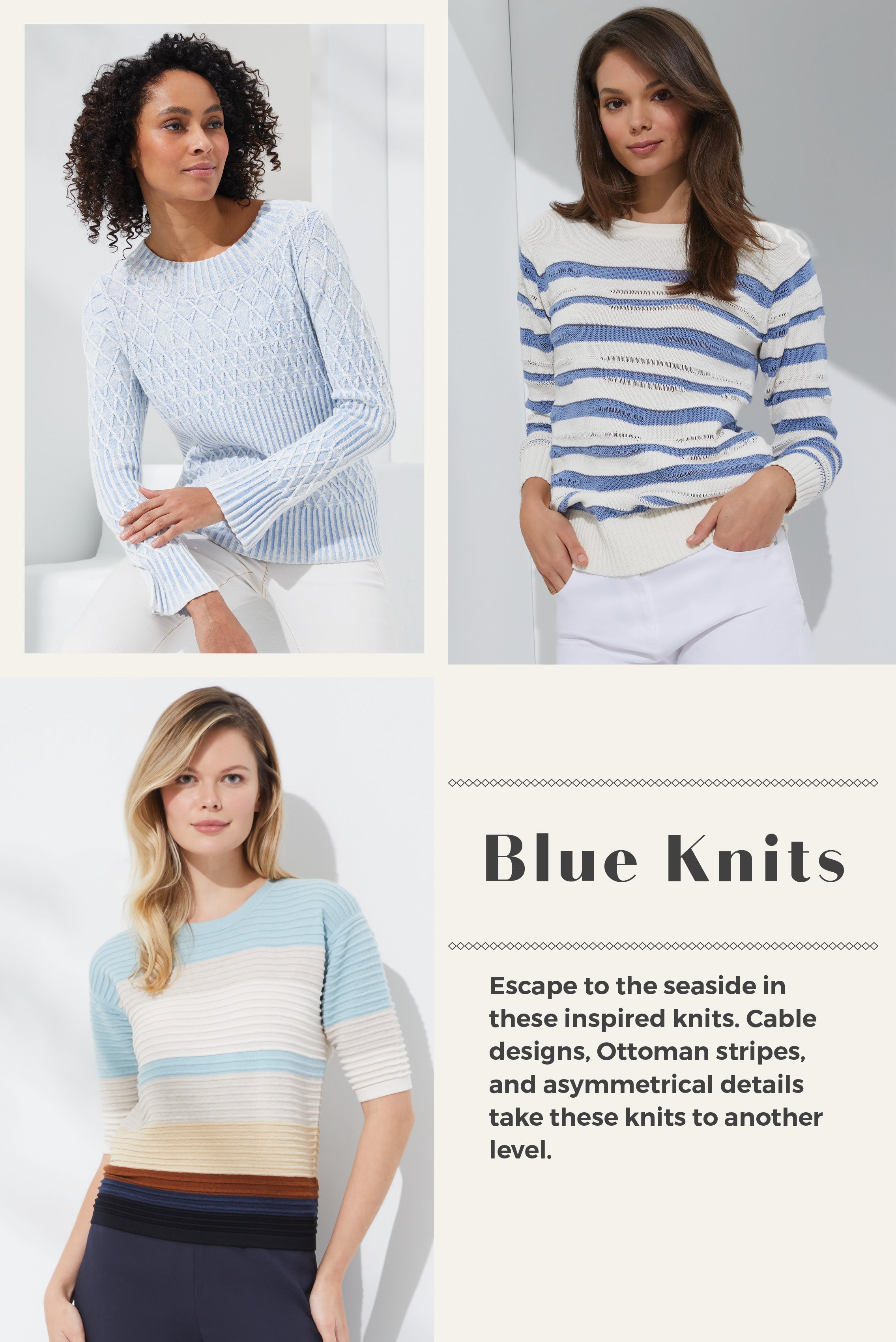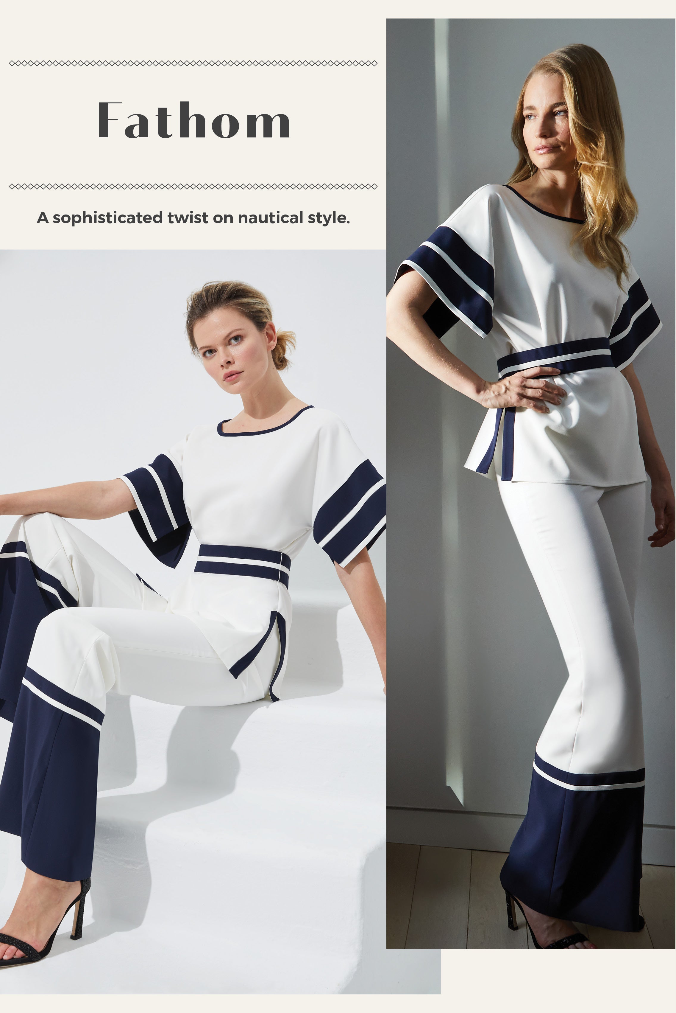 "These styles represent a voyage of the heart and soul, celebrating the timeless allure of the sea and the enduring romance of coastal living. With each ensemble, wearers embark on their own seaside adventure, capturing the magic of the ocean and the yearning for limitless horizons. Picture a woman standing in front of the vastness of the sea with romantic longing in her heart. She travels the globe in search of the perfect shoreline experience wearing nautical fashions that evoke the allure of a coastal romance. Incorporating elements of yachting culture and nautical terms, this shipshape collection called La Mer reimagines classic styles with a fresh and contemporary twist. Striped knits and hoodies embody the casual elegance of a day on deck, while jazzy jacquards and romantic prints mirror the whimsy and nostalgia of seaside escapes. Lounge-friendly silhouettes and fabrics invite comfort and relaxation, reminiscent of lazy days by the shore. The limpid clarity of the palette echoes the tranquil beauty of the sea, capturing the watery source of inspiration in each look. The enchanting Debussy orchestral piece La Mer serves as the collection's soundtrack, echoing the fluidity and grace of every piece."