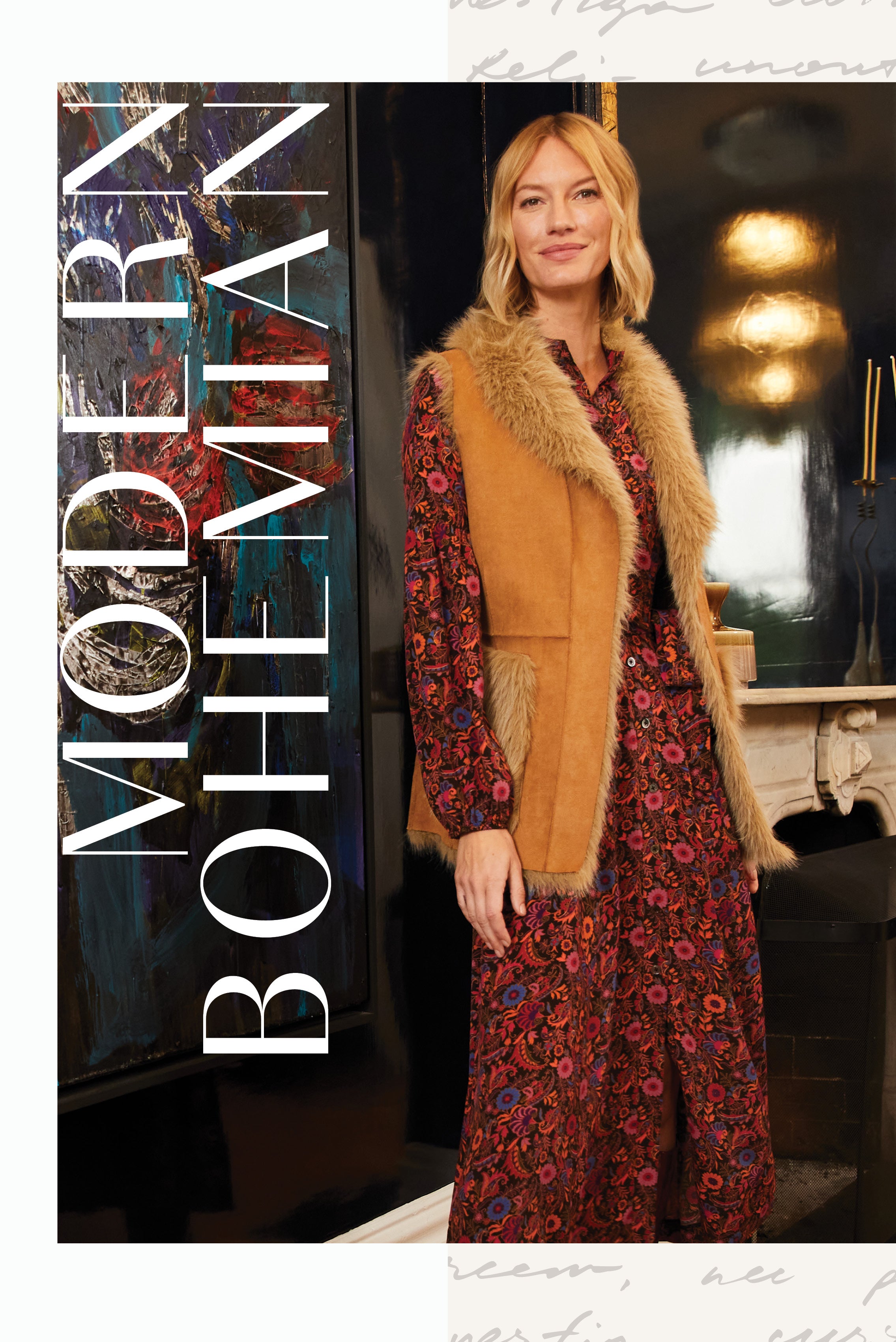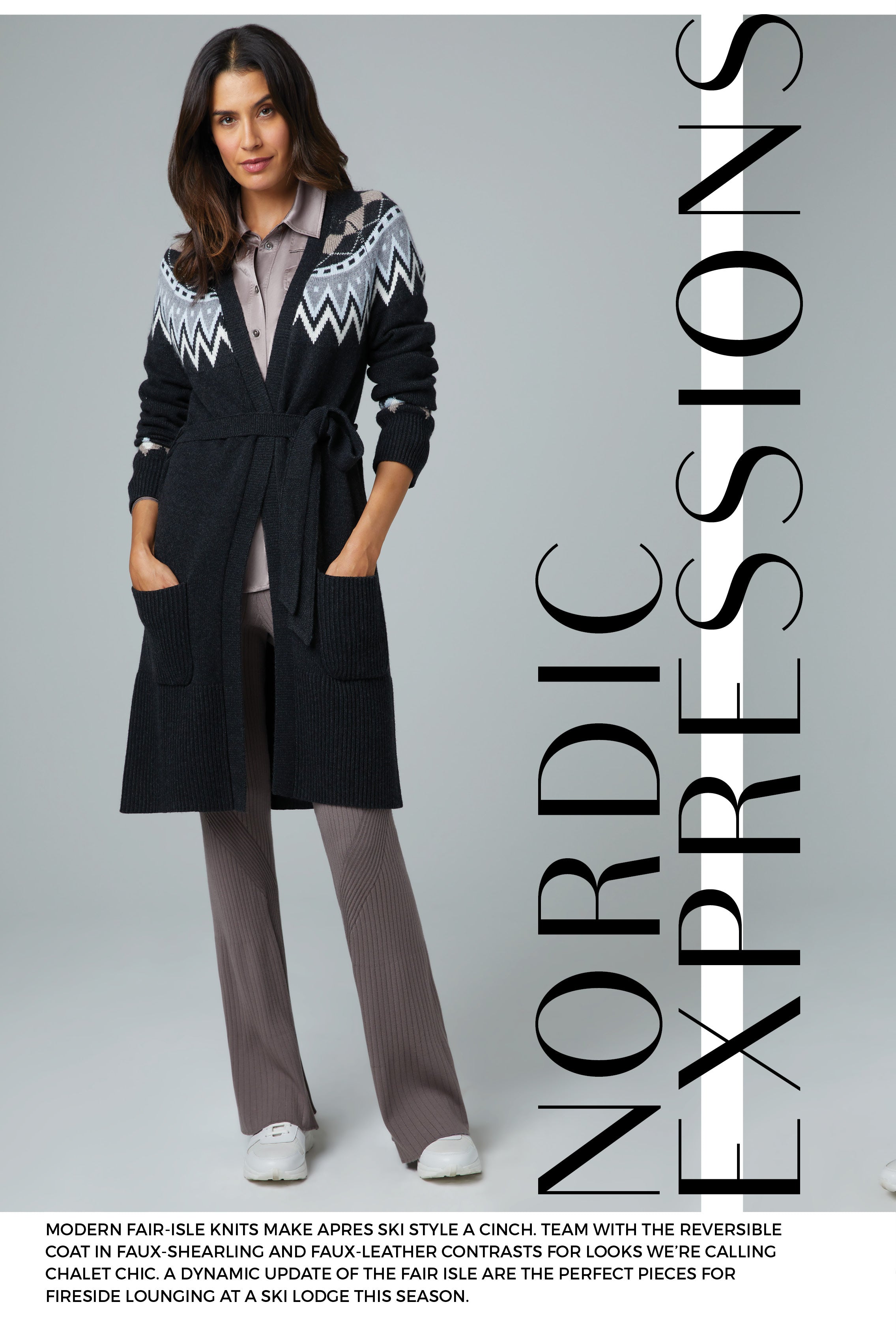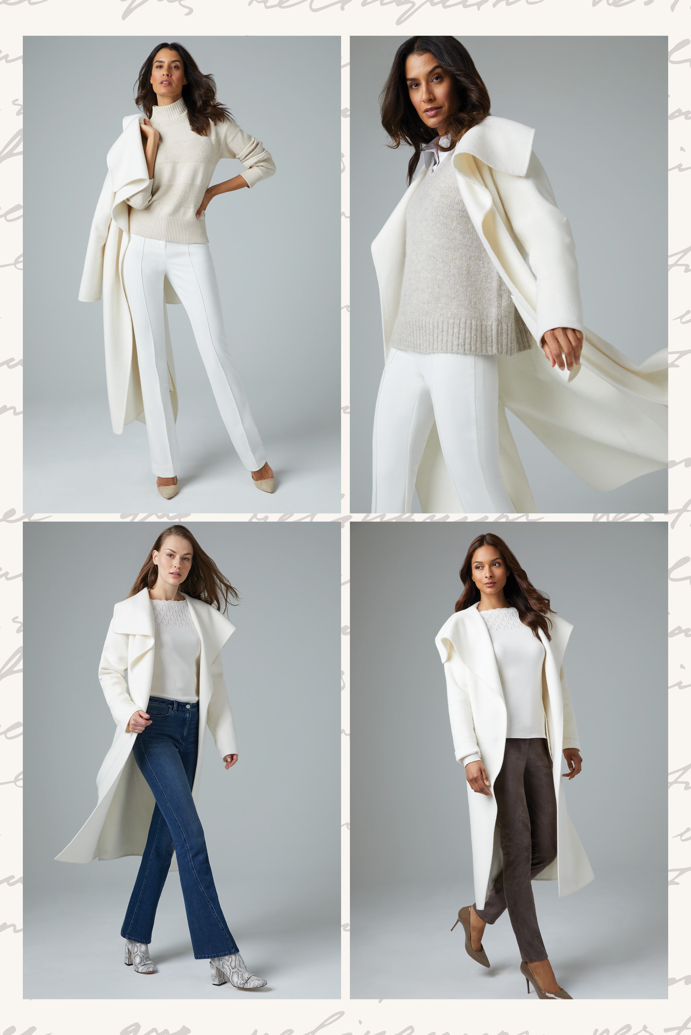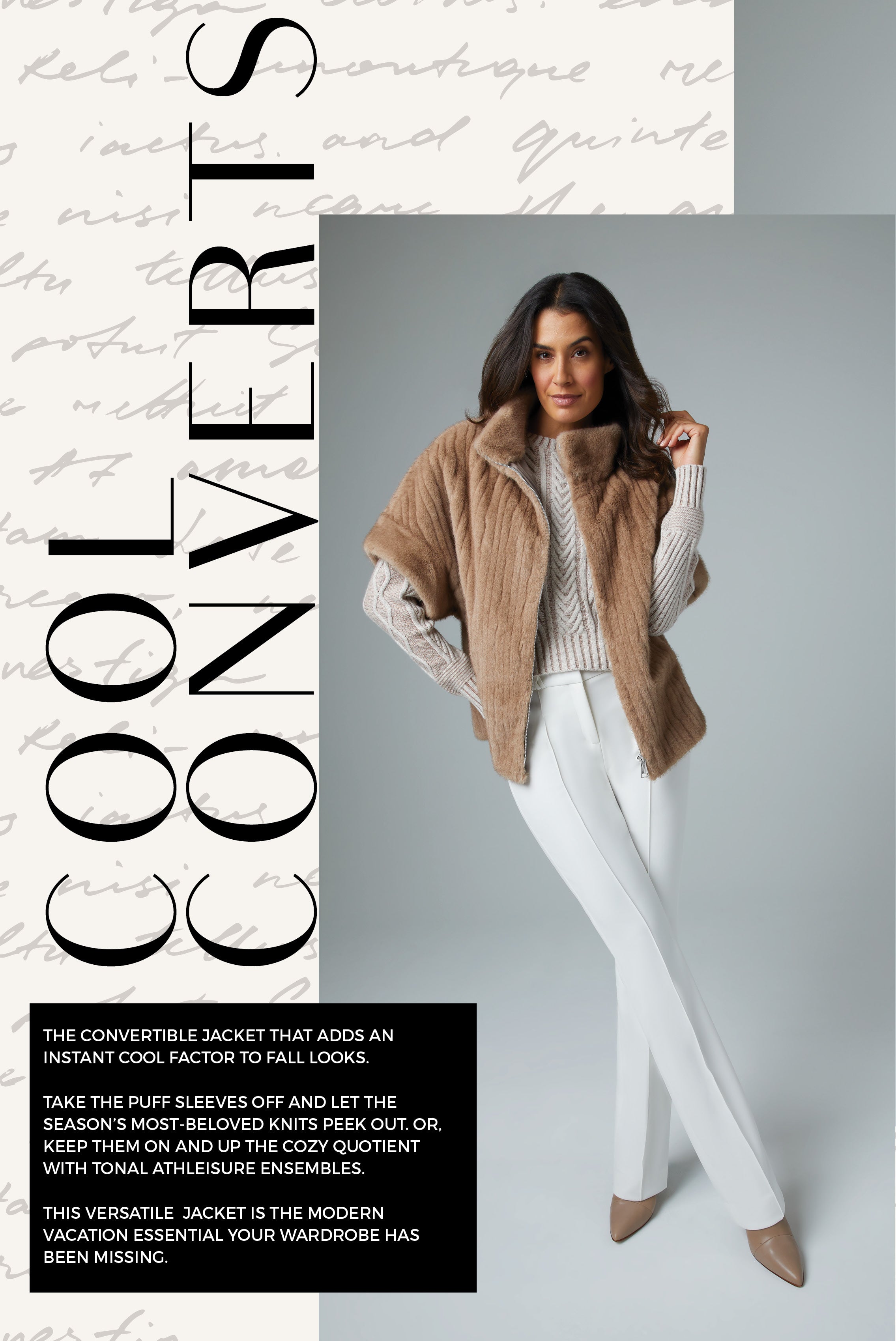 ‘TIS THE SEASON FOR LAYERING — AND THIS SEASON UPS THE ANTE WITH MUST-HAVE STYLES THAT MIX AS WELL AS THEY MATCH. THE ULTIMATE WINTER WHITE COAT, COMPLETE WITH CASCADING COLLAR, GOES WITH EVERYTHING. A SPICED ORANGE-HUED COAT IS A BOLD ADDITION THAT USHERS IN THE SEASON WITH A QUINTESSENTIAL FALL PALETTE. CHIC VESTS AND CONVERTIBLE JACKETS MAKE LAYERED LOOKS EFFORTLESSLY ELEVATED. A REVERSIBLE MIXED FAUX SHEARLING AND FAUX LEATHER JACKET, IN ASH AND BLUE FOX, IS UNLIKE ANYTHING YOU’VE EVER SEEN.
