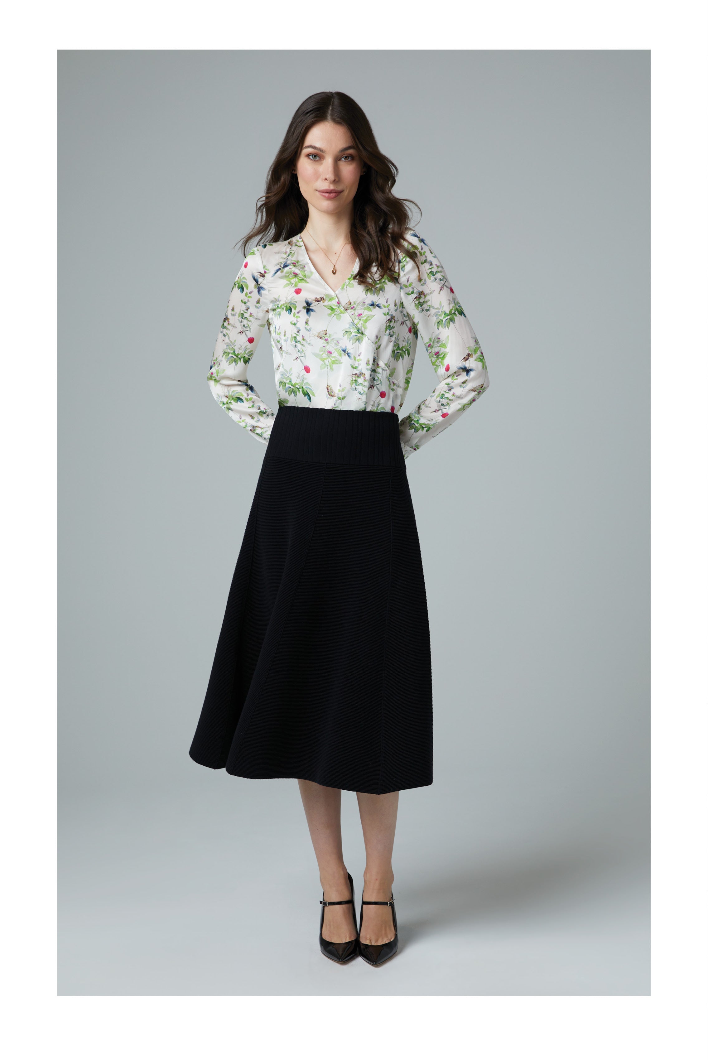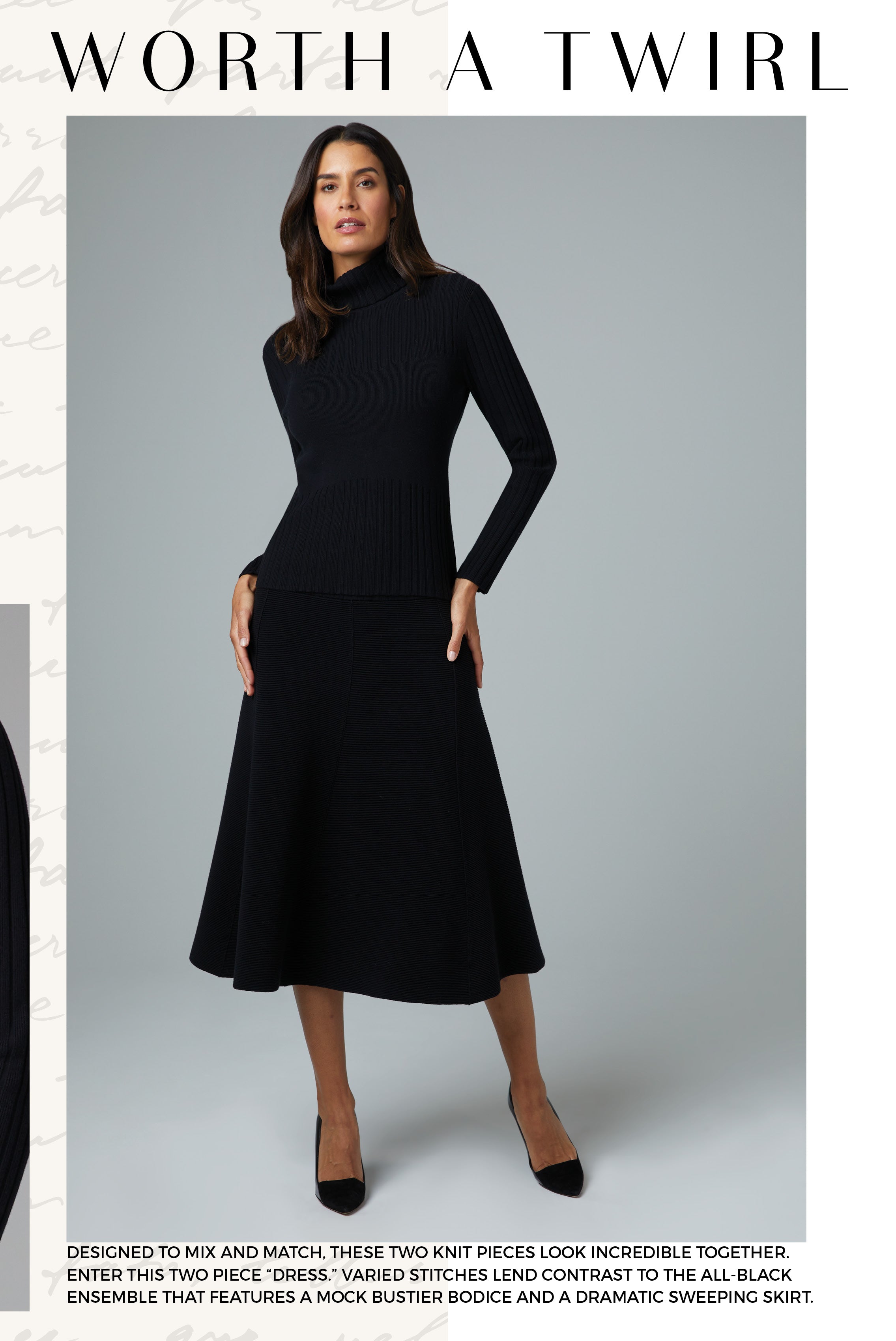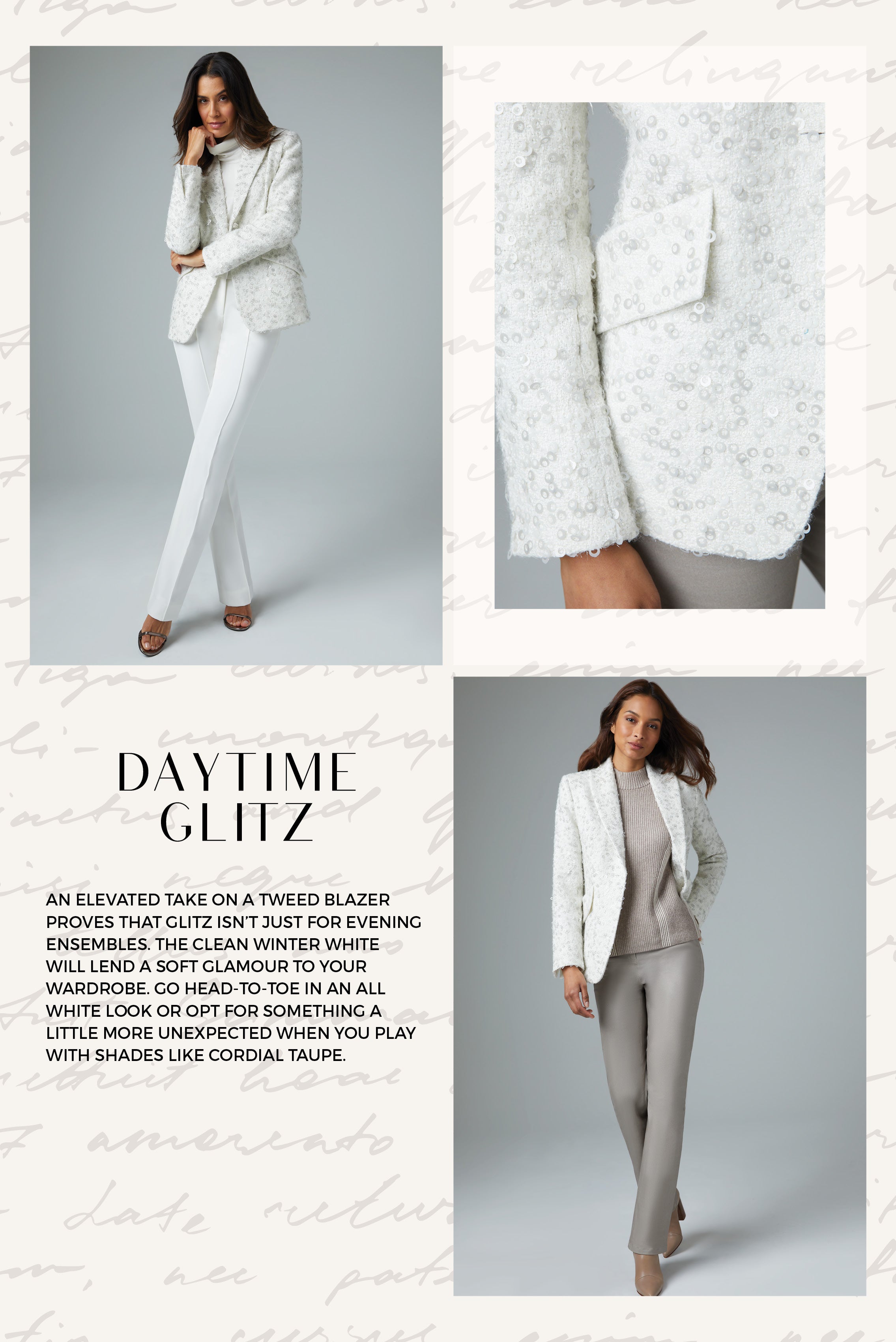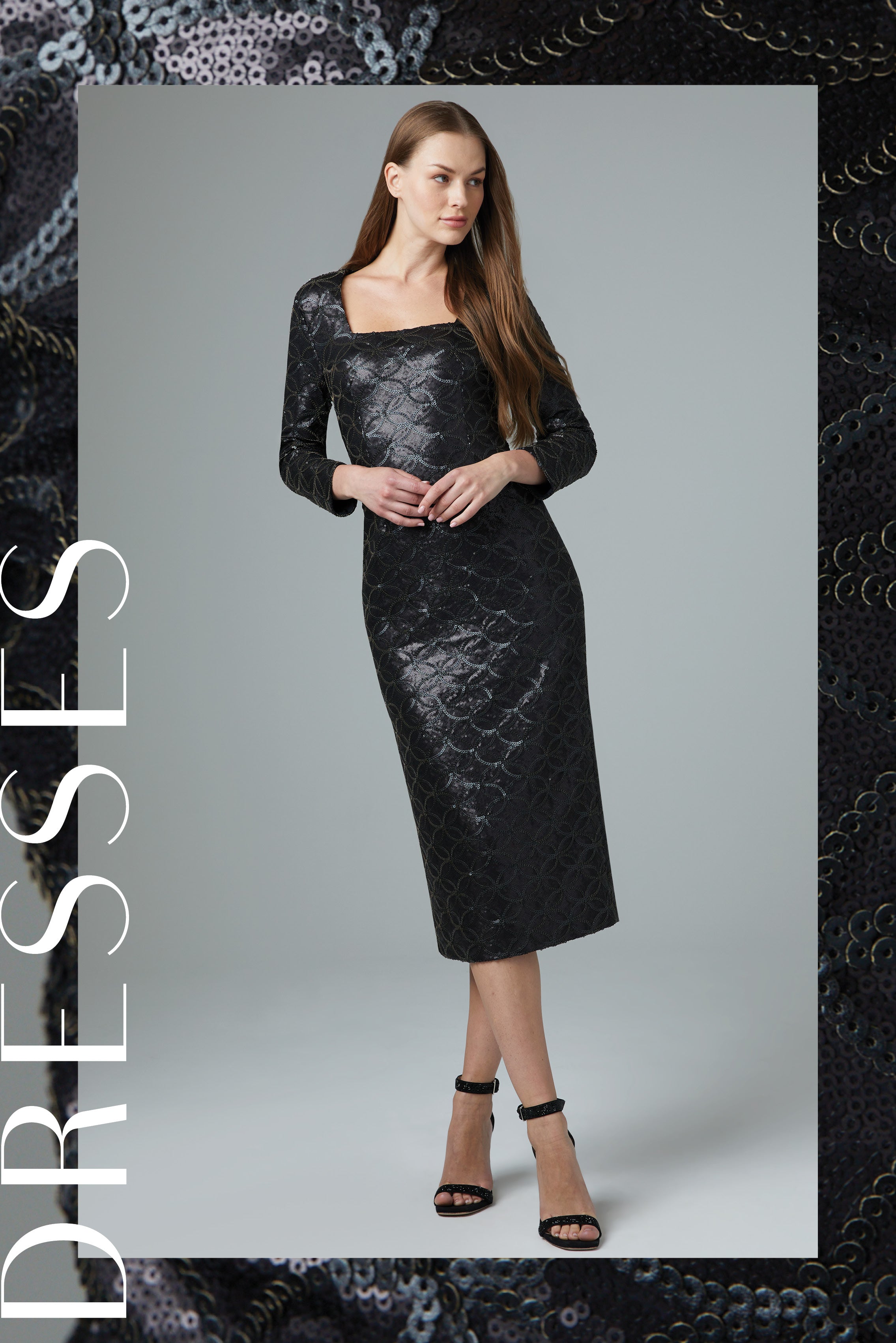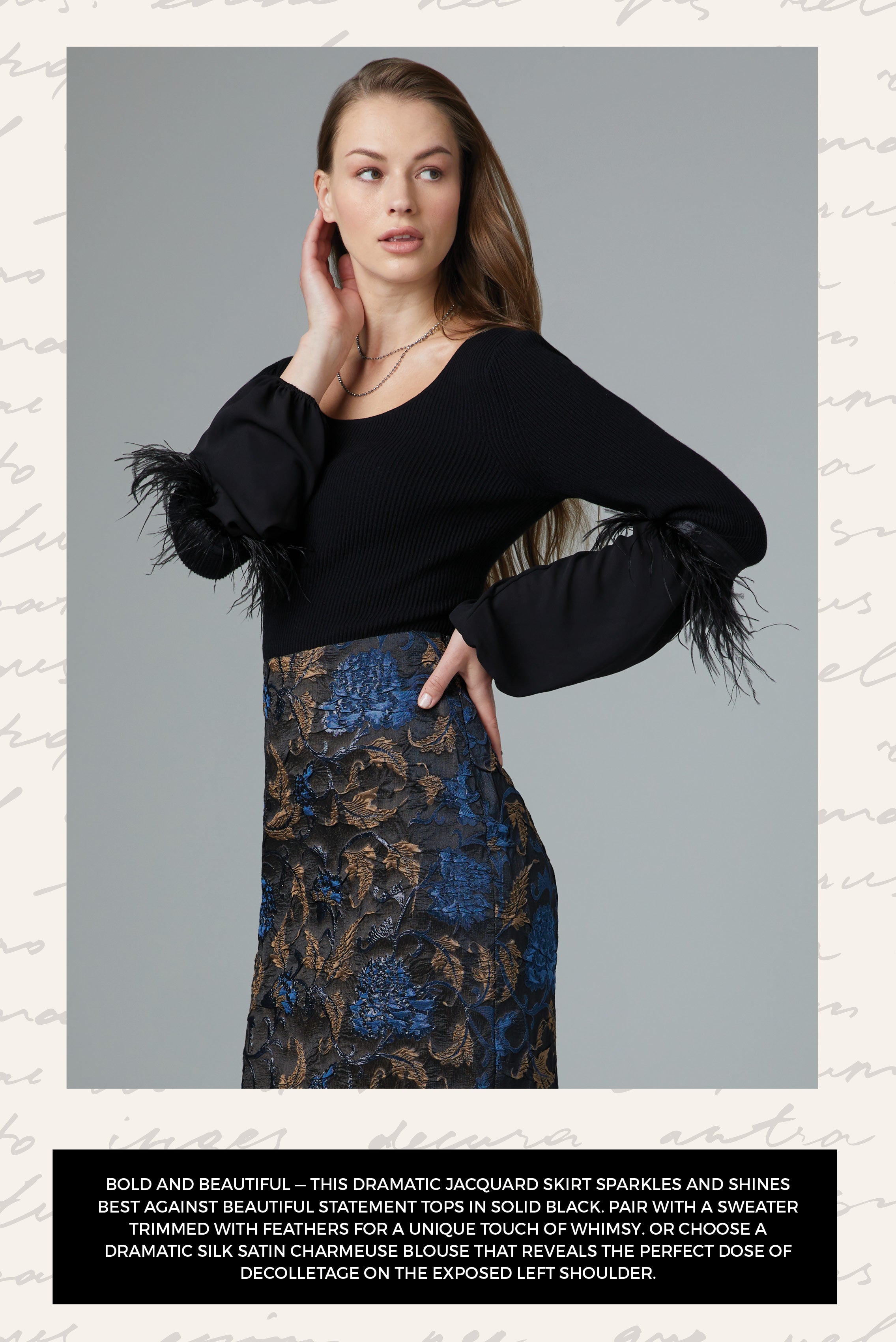 HOLIDAY DRESSING GETS A SPECTACULAR UPDATE WITH TWIRL-WORTHY PARTY DRESSES, INTRIGUING BLOUSES, CAPTIVATING LBDS, AND SO MUCH MORE. THE PANNIER DRESS IS A FUSION OF TIMELESS ELEGANCE AND CREATIVE TWISTS — A DRAMATIC BUBBLE-HEM IS CUT FROM A RARE TWO-TONED MOIRÉ WORTHY OF AN ANCIEN RÉGIME ARISTOCRAT. THERE’S A LITTLE BLACK DRESS FOR EVERY OCCASION. A WINTER WHITE BLAZER DELIVERS DAYTIME GLITZ WITH ALL-OVER SEQUINS. MODERN PERSONALITY WITH THEATRICAL OPULENCE COMES IN A DAZZLING METALLIC MATELASSÉ FLOWER AND LEAF JACQUARD SKIRT.