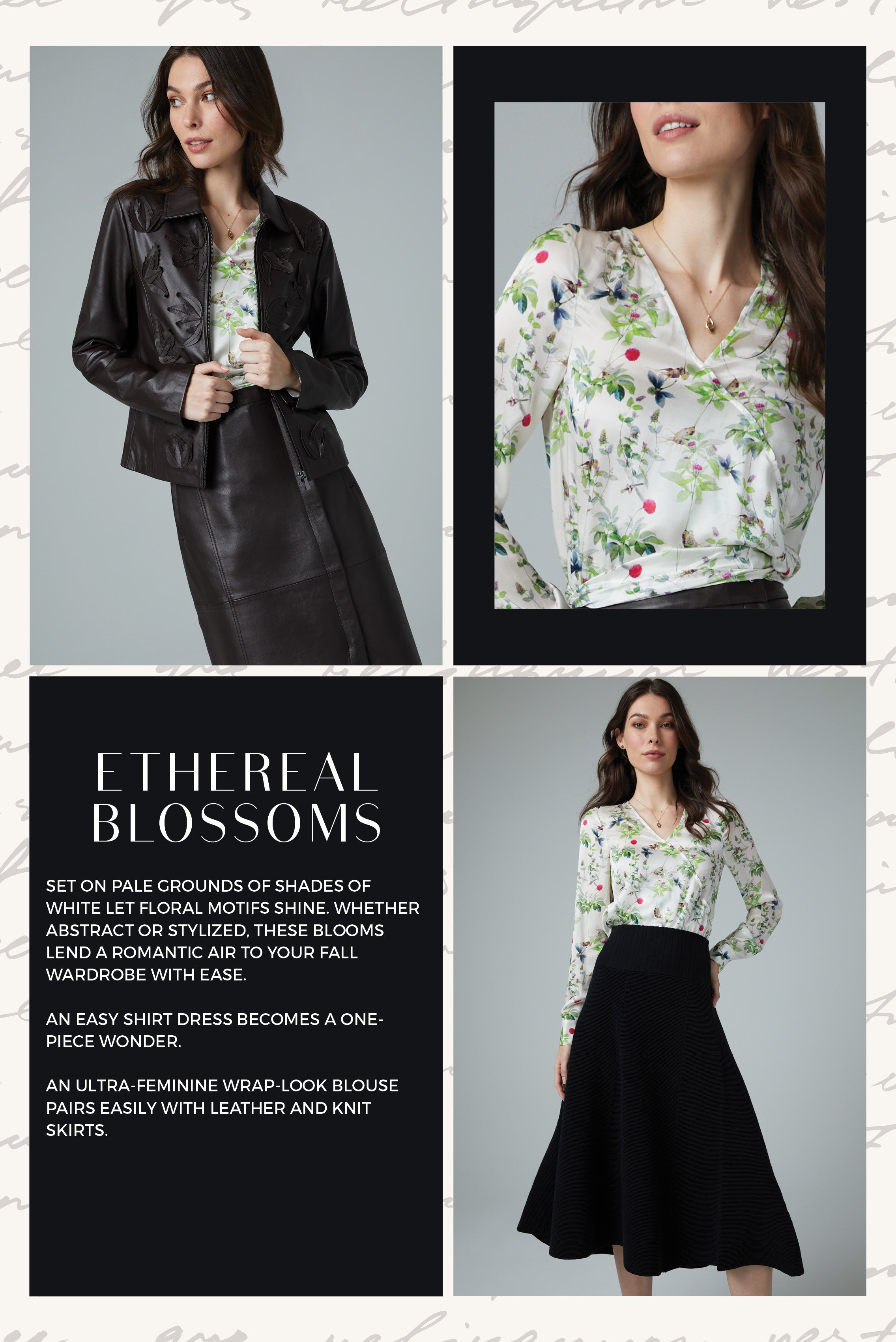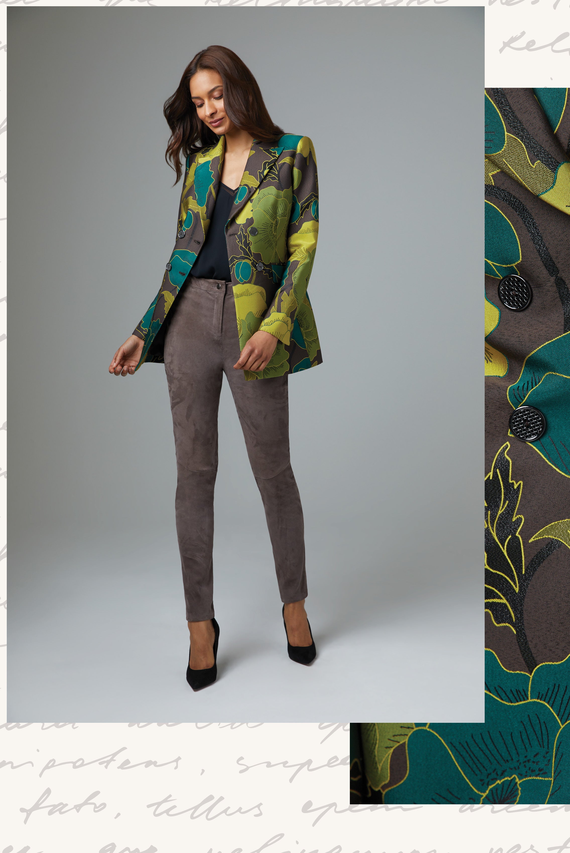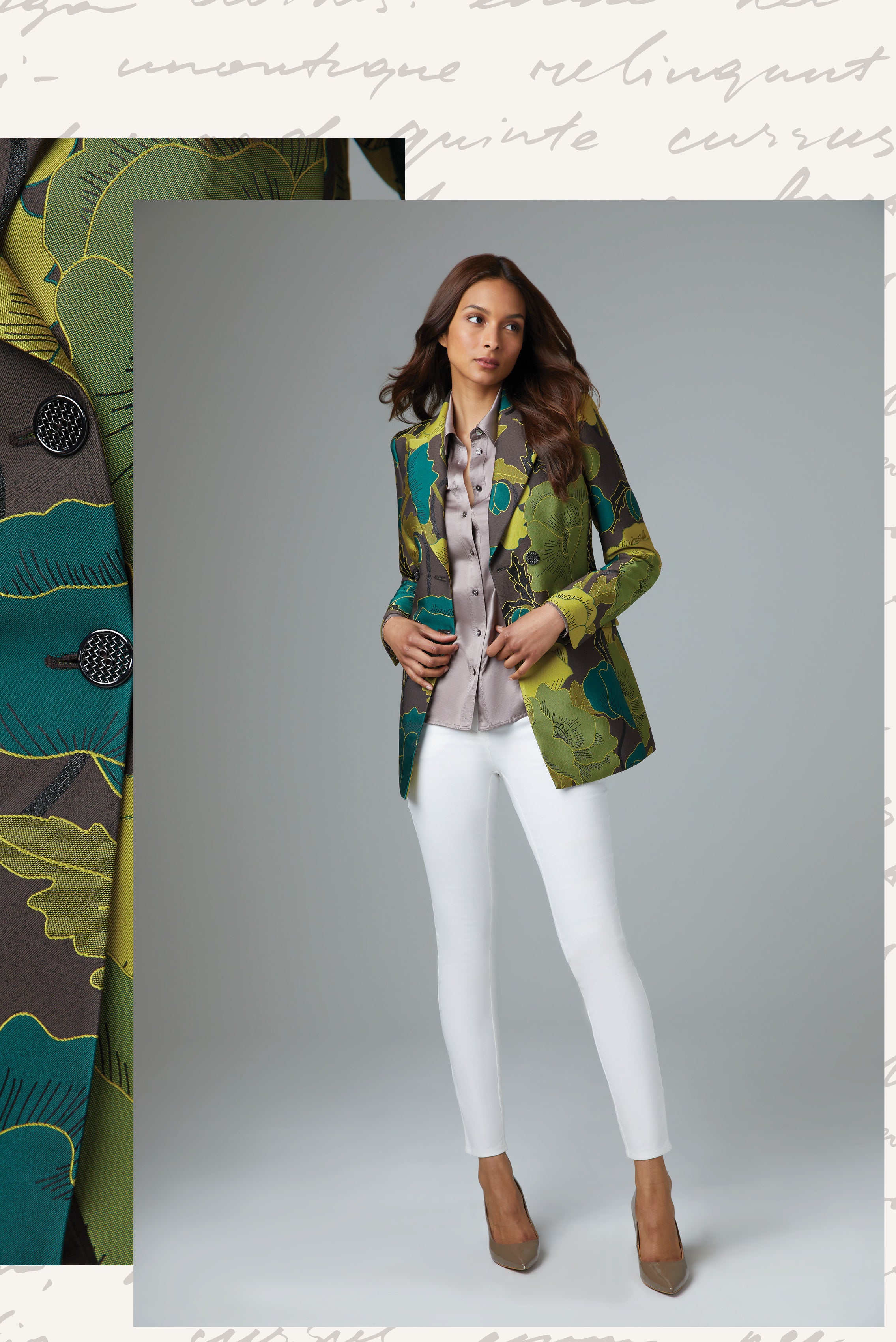 FALL’S VERSION OF FLORALS ARE RICHER AND MOODIER THAN THEIR SPRING COUNTERPARTS. THIS ETHEREAL DANCE OF TEXTURE AND MOVEMENT INCLUDES EXTRAVAGANT FLORAL PIECES. THIS SPLASHY JACQUARD BLAZER IN THREE GREENS, BRONZE, AND CHOCOLATE IS A RIVETING DOUBLE-BREASTED LOOK WITH AN EXCITING OVERSIZED FLORAL PATTERN. ETHEREAL BLOSSOMS TRANSFORM DRESSES AND BLOUSES ALIKE. A MAXI DRESS IS ENLIVENED WITH MODERN BOHEMIAN FLAIR. A MESH CUTAWAY JACKET LENDS DIMENSION WITH A STUNNING USE OF EMBROIDERED FLORALS.