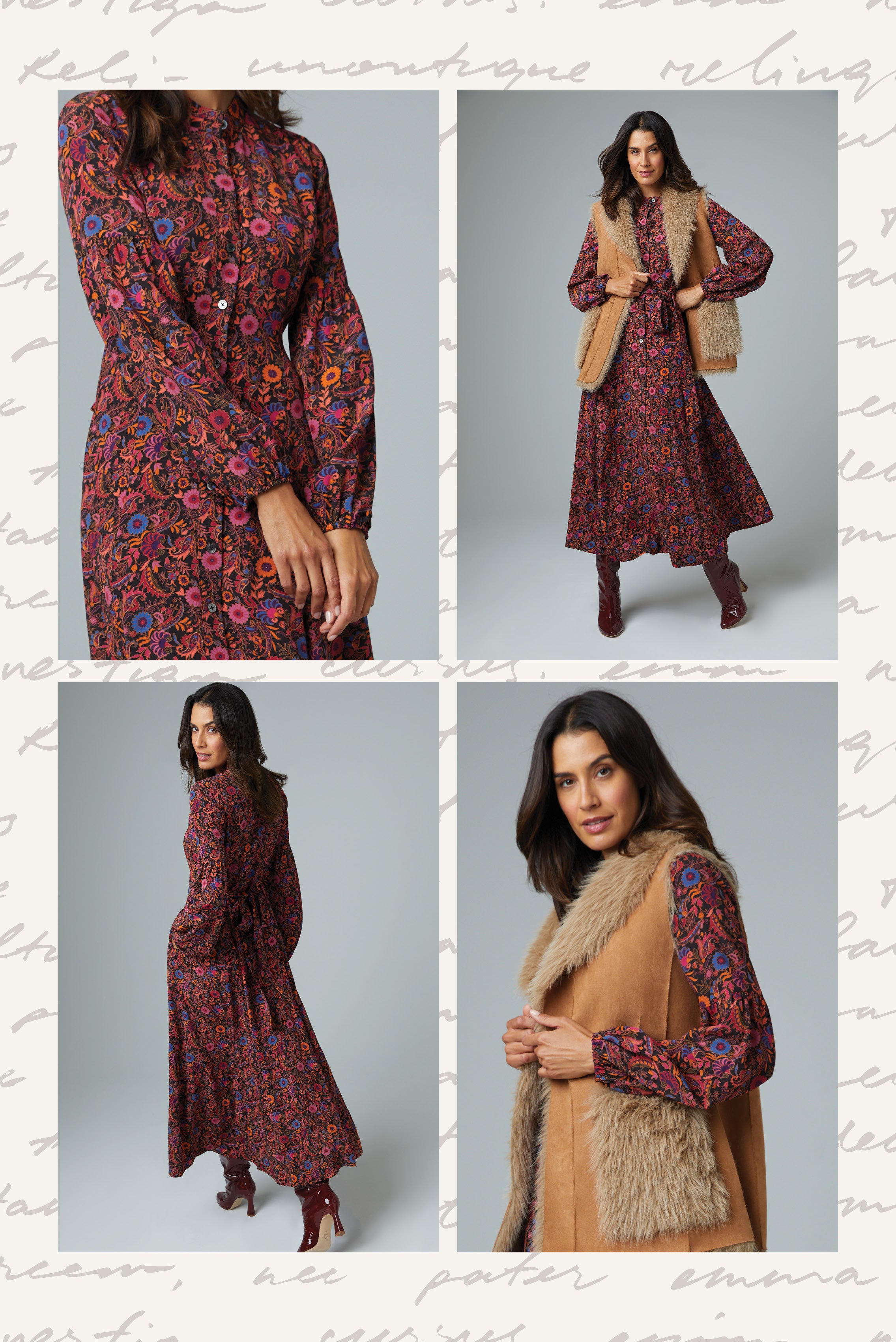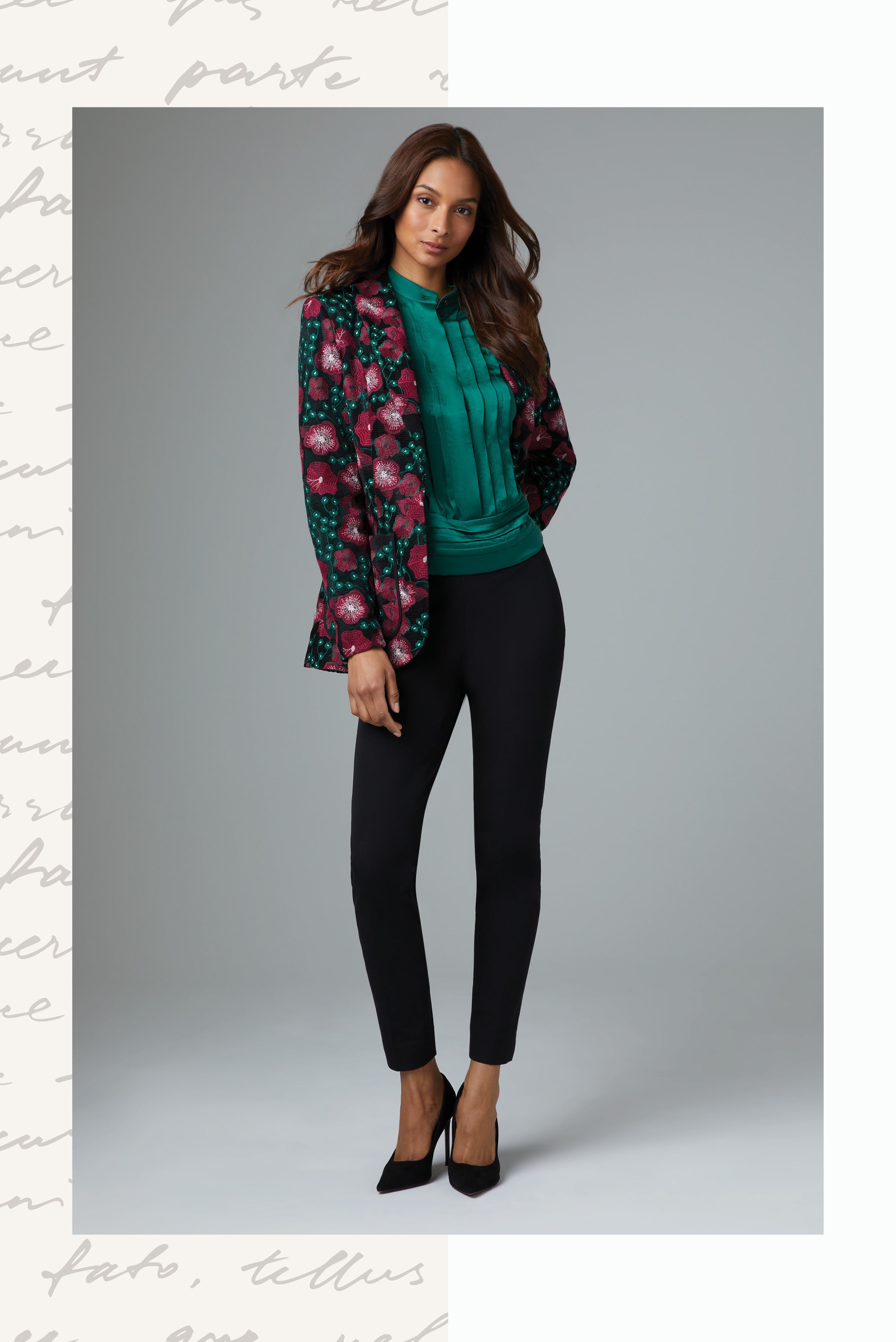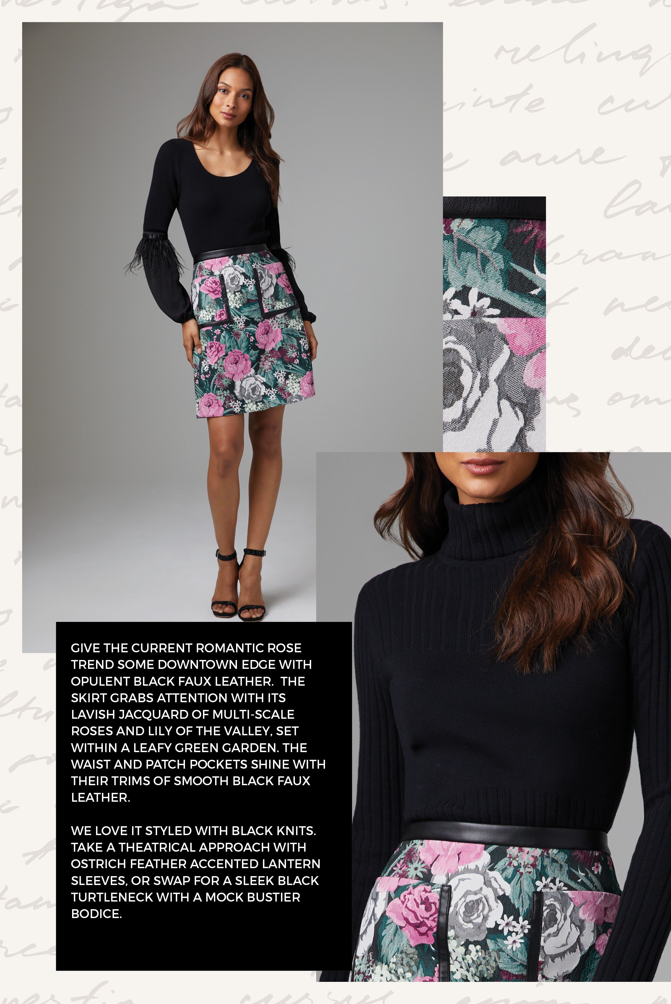 FALL’S VERSION OF FLORALS ARE RICHER AND MOODIER THAN THEIR SPRING COUNTERPARTS. THIS ETHEREAL DANCE OF TEXTURE AND MOVEMENT INCLUDES EXTRAVAGANT FLORAL PIECES. THIS SPLASHY JACQUARD BLAZER IN THREE GREENS, BRONZE, AND CHOCOLATE IS A RIVETING DOUBLE-BREASTED LOOK WITH AN EXCITING OVERSIZED FLORAL PATTERN. ETHEREAL BLOSSOMS TRANSFORM DRESSES AND BLOUSES ALIKE. A MAXI DRESS IS ENLIVENED WITH MODERN BOHEMIAN FLAIR. A MESH CUTAWAY JACKET LENDS DIMENSION WITH A STUNNING USE OF EMBROIDERED FLORALS.