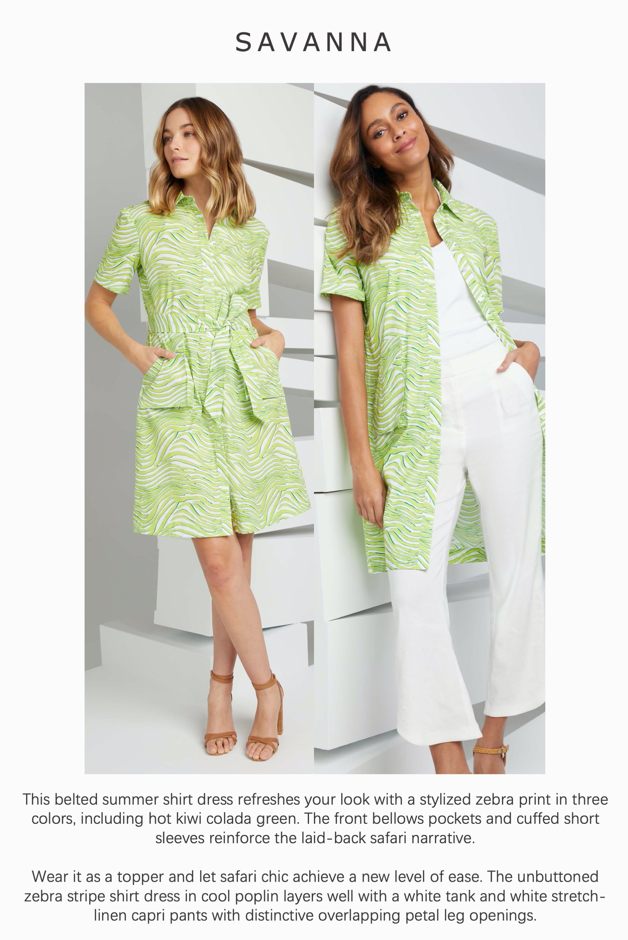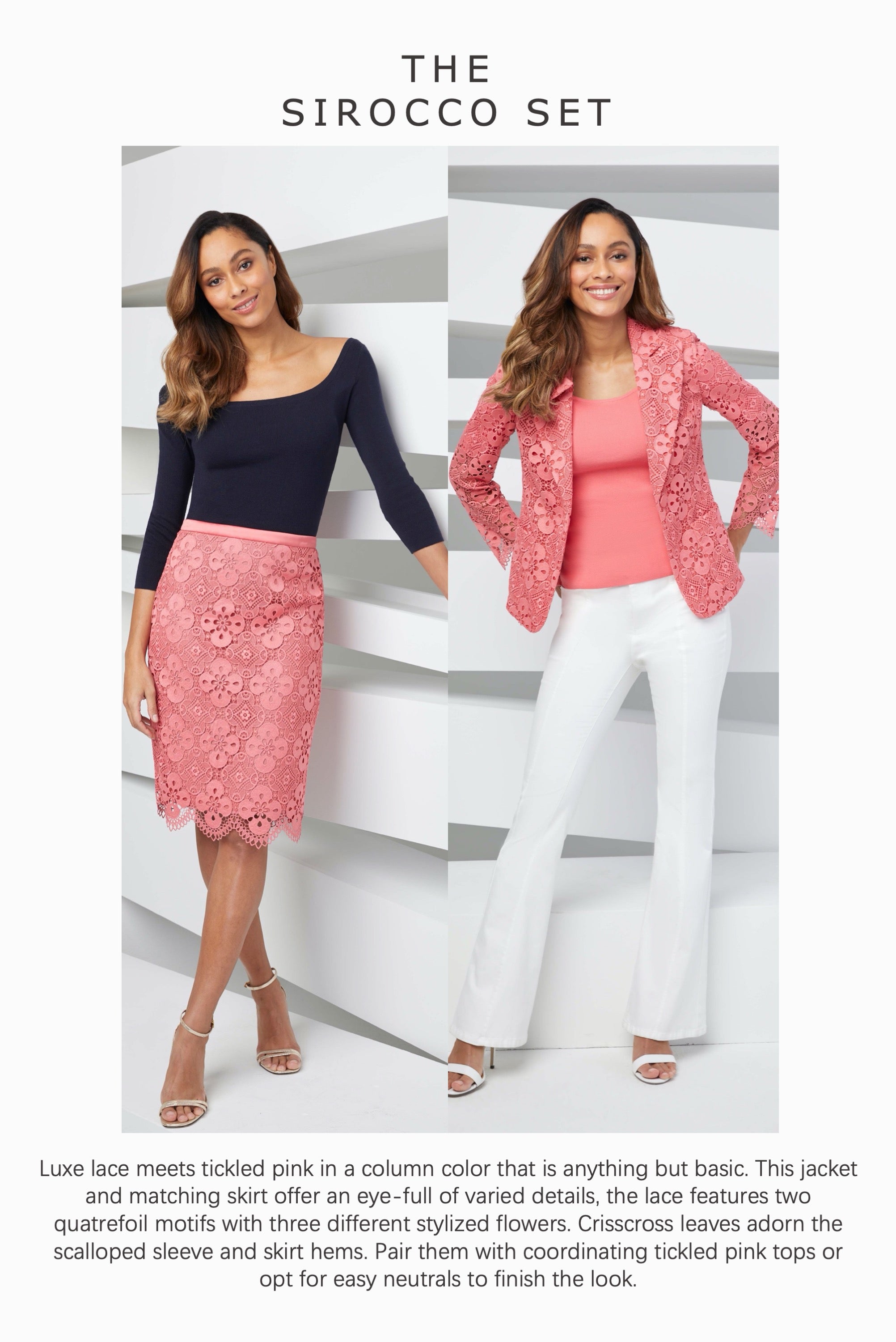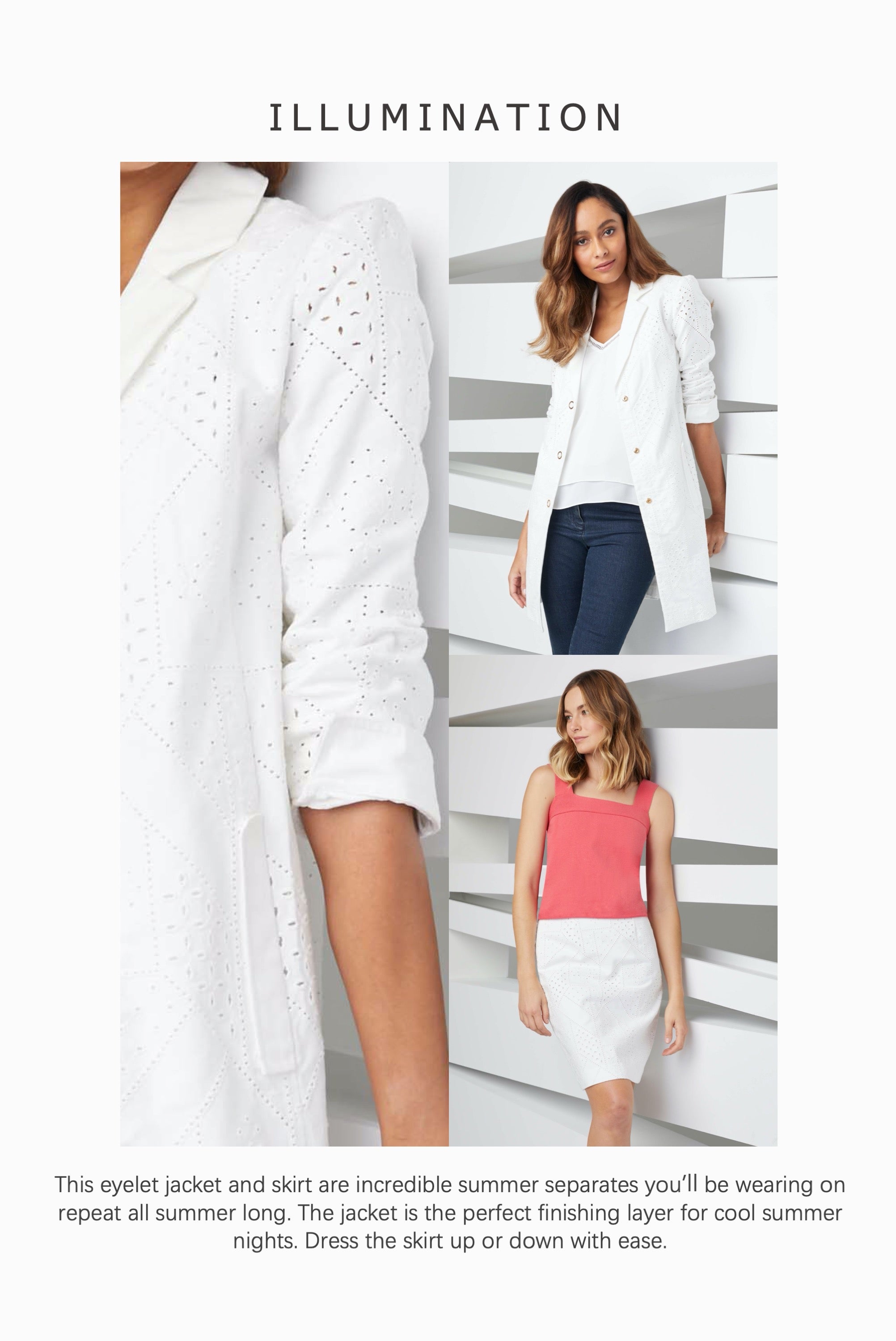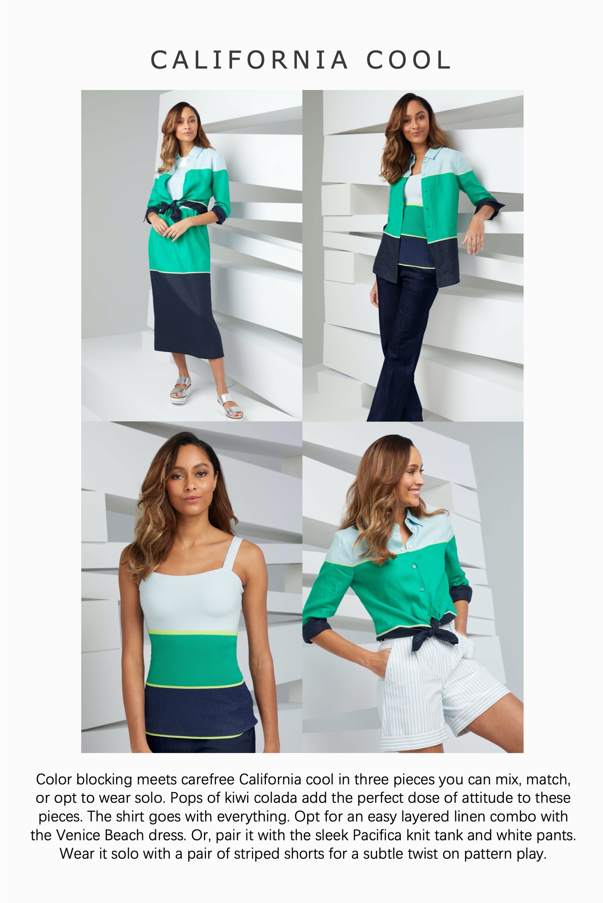 Airy summer creations take their cue from a panoply of radiant summer shades, designed to look good under the intense summer sun. Crocus purple was born to grace refreshing floral print pants. Kiwi colada takes green into a spicy acid range. Tickled pink provides feminine charm, from fancy lace pieces to cross-dyed denim jeans. Festive firecracker orange dresses and skirts and seven-color mitered stripes punch up your summer wardrobe for a thrilling Fourth of July.