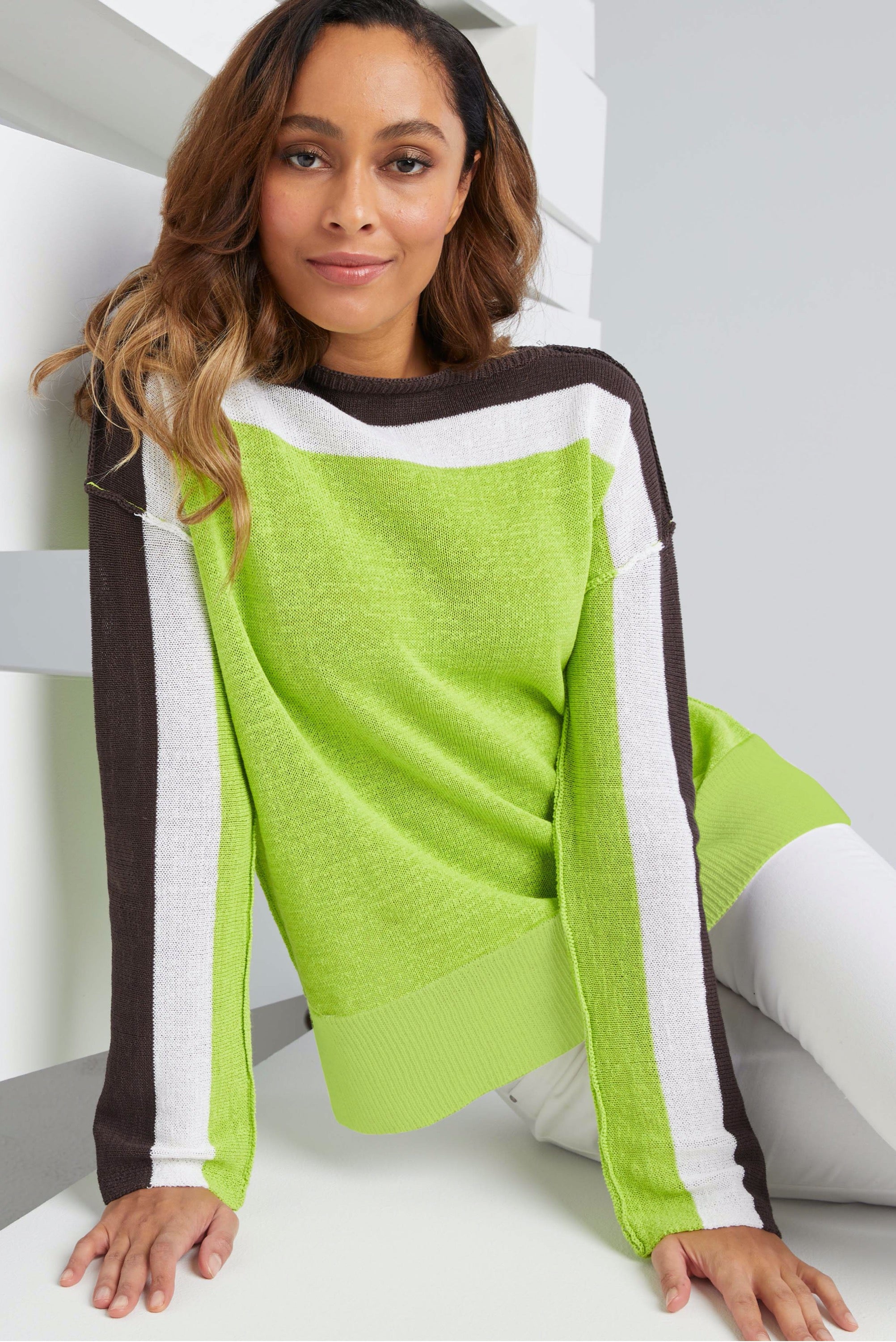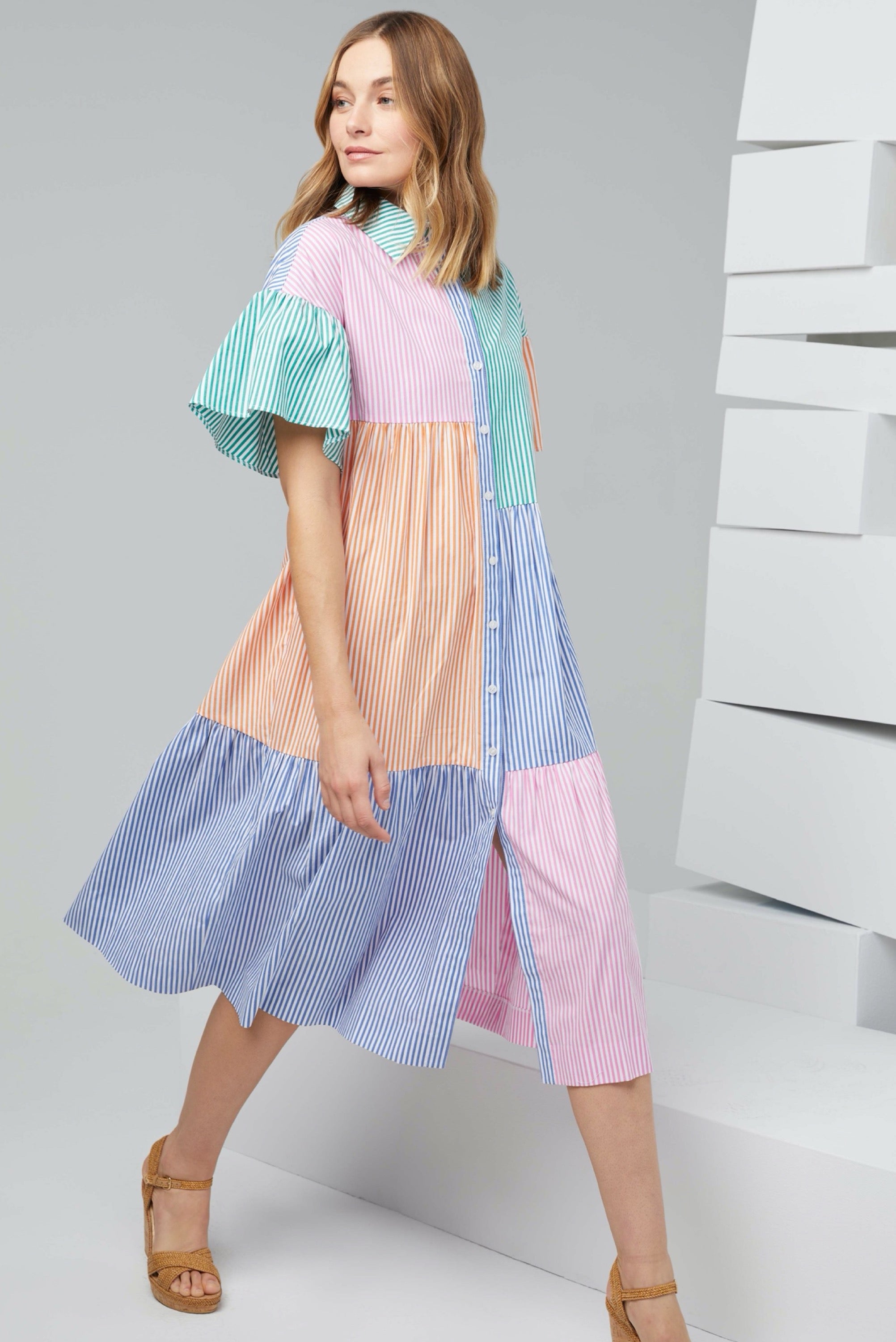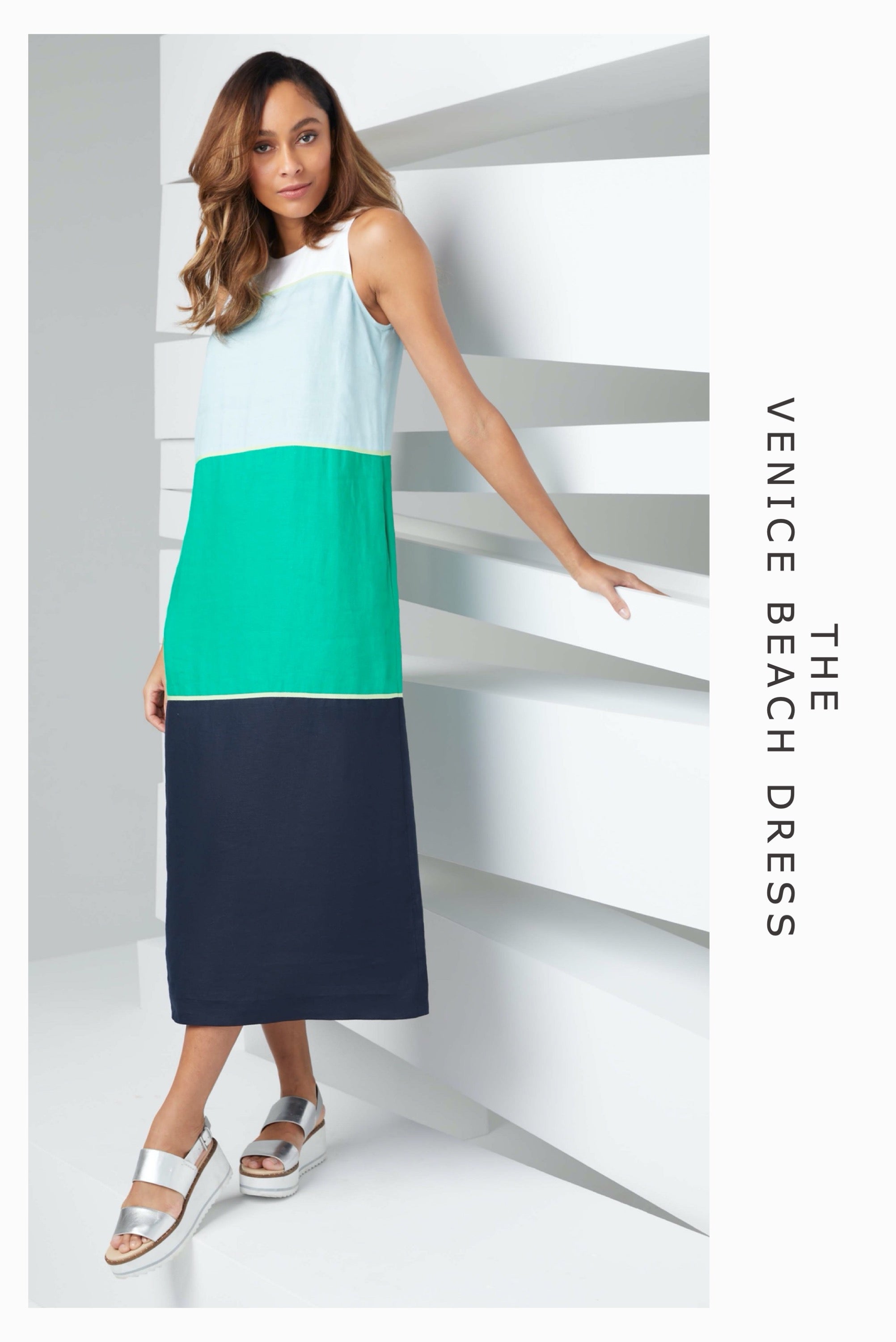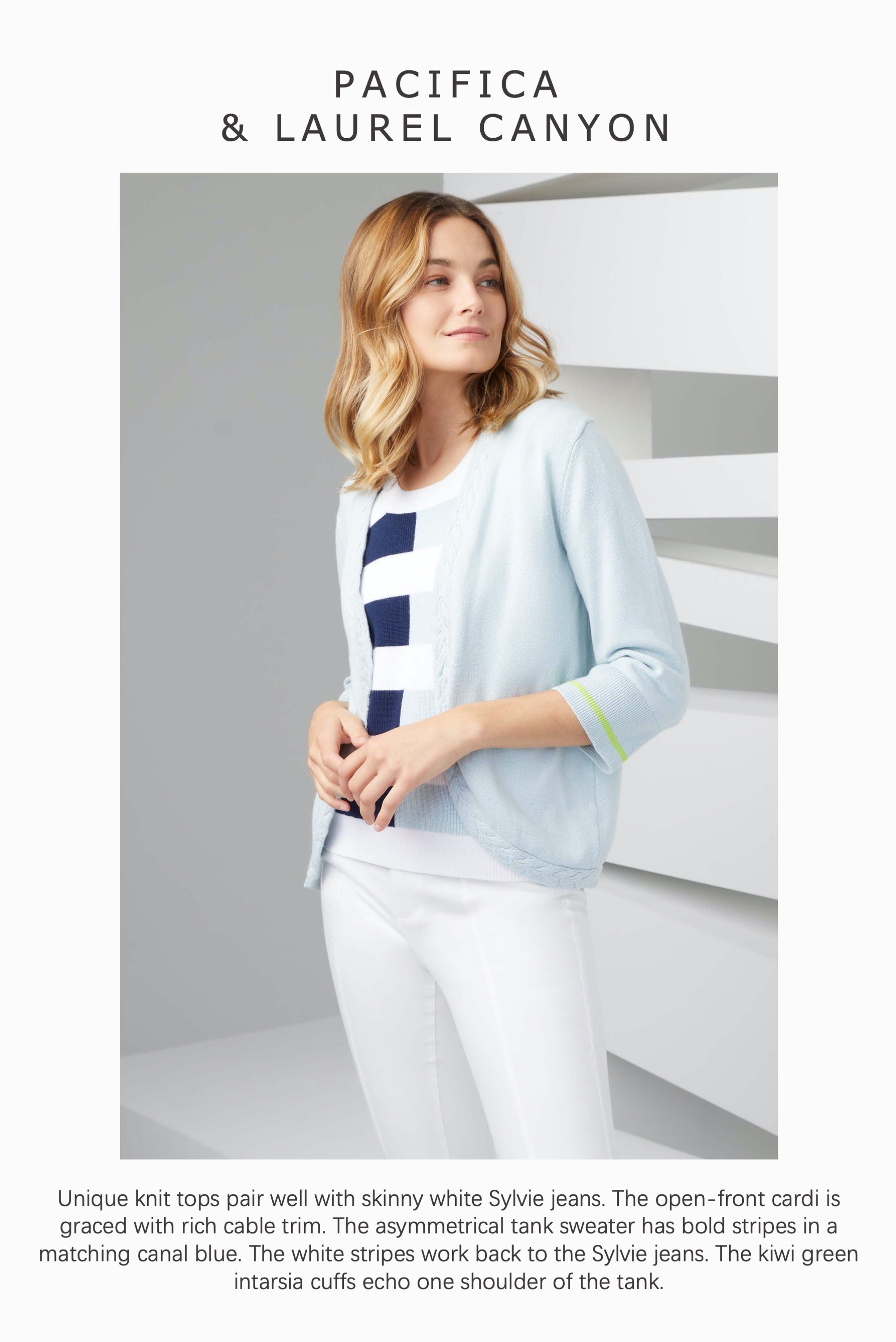 Airy summer creations take their cue from a panoply of radiant summer shades, designed to look good under the intense summer sun. Crocus purple was born to grace refreshing floral print pants. Kiwi colada takes green into a spicy acid range. Tickled pink provides feminine charm, from fancy lace pieces to cross-dyed denim jeans. Festive firecracker orange dresses and skirts and seven-color mitered stripes punch up your summer wardrobe for a thrilling Fourth of July.