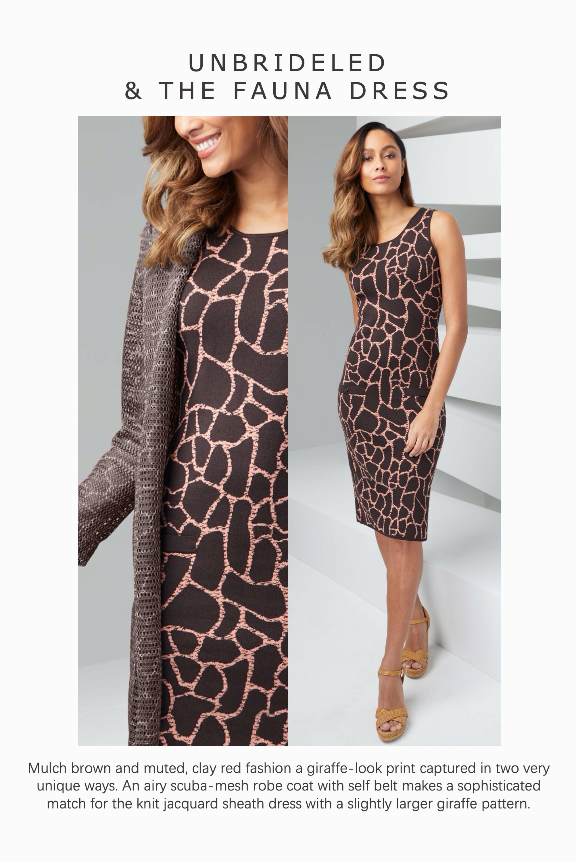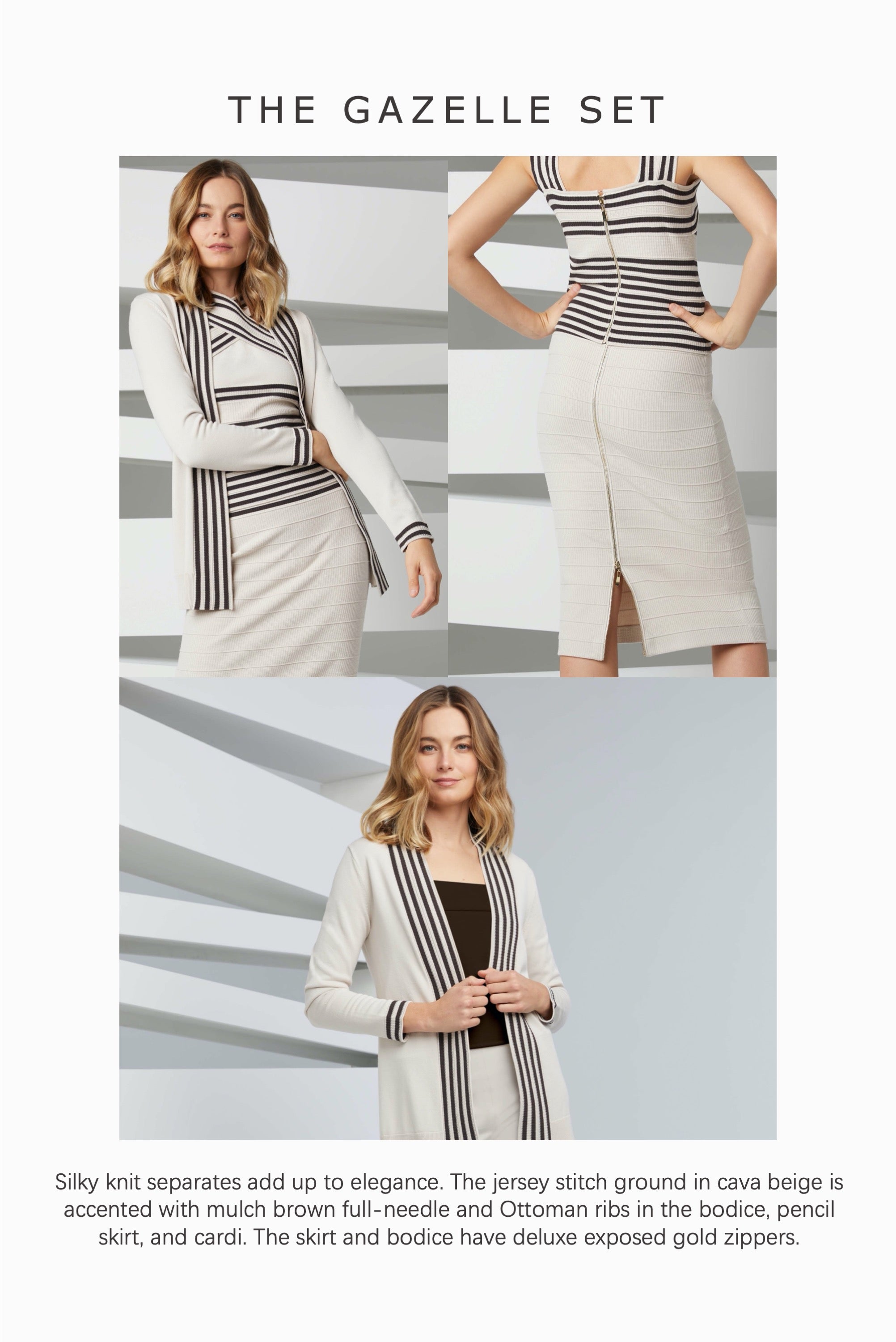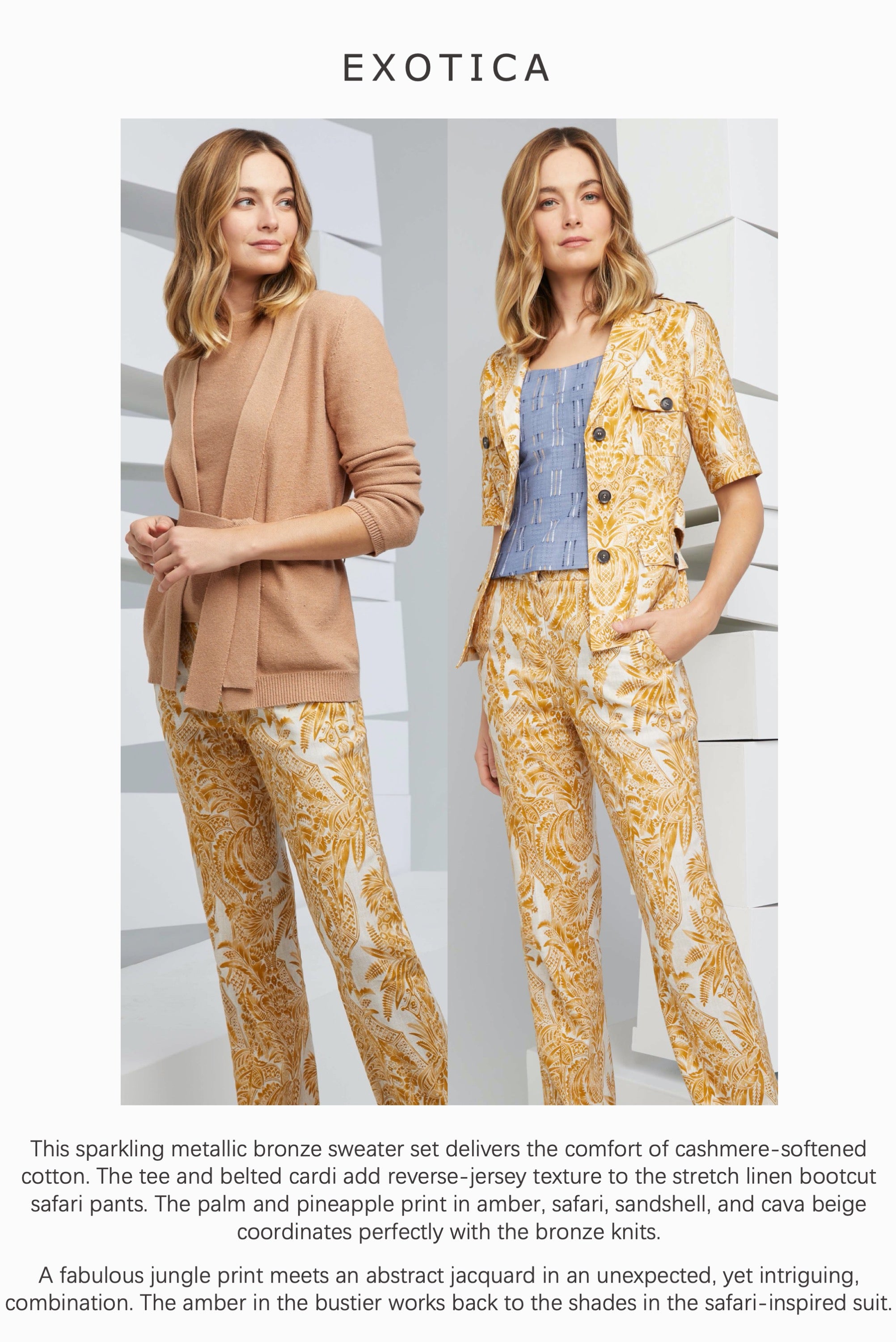 From the desert to the jungle, this season takes inspiration from the untamed wilderness. A giraffe inspires patterns in sophisticated clay and mulch shades that work together as a versatile neutral. The fleet and elegant gazelle influences the muted neutrals in fancy knits with streamlined stripes. The wild expanses of arid grasses and flowers of the Savanna inform the delicate embroidery and colors of mixable separates. Despite their wilderness source, all these pieces represent the height of urban sophistication.
