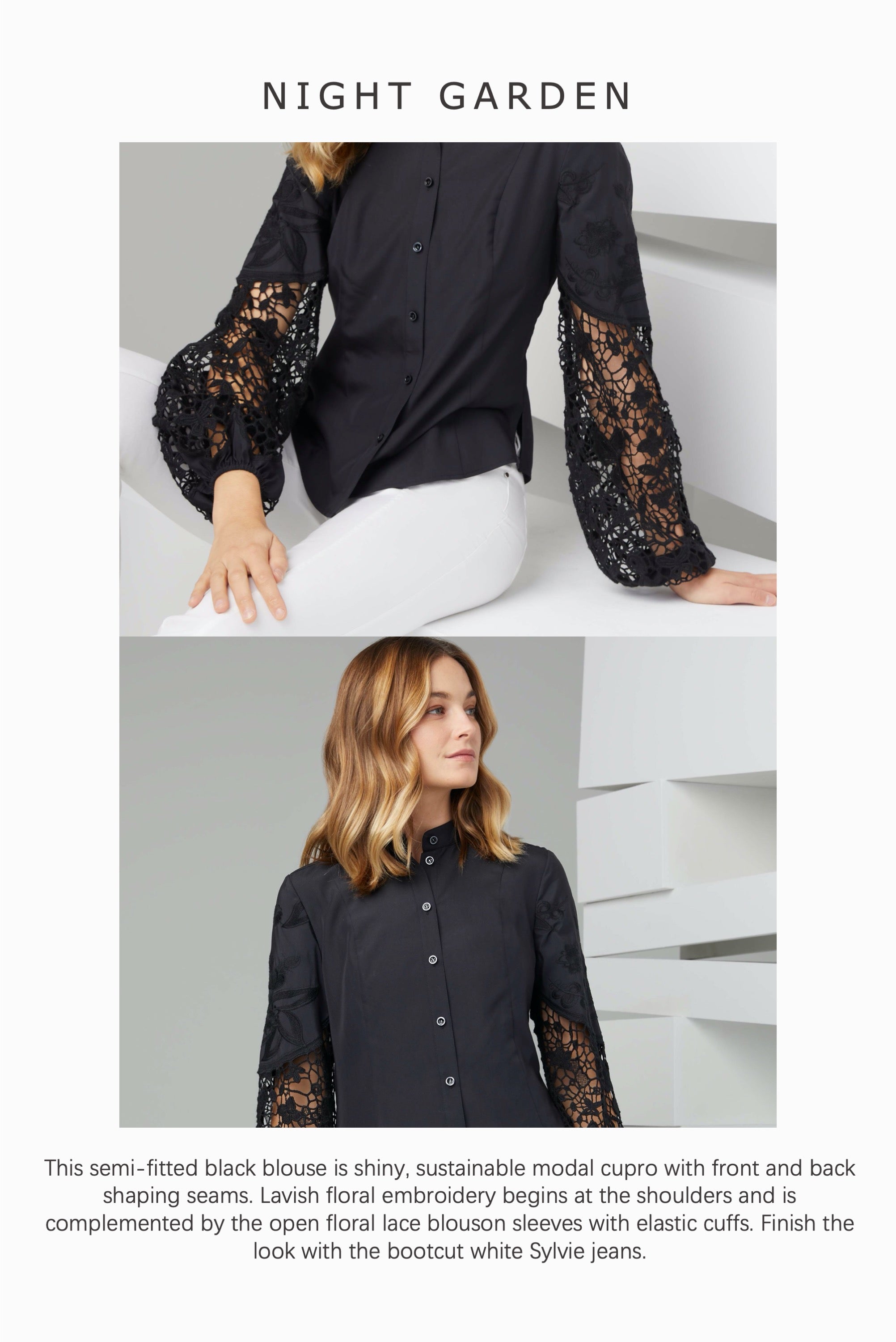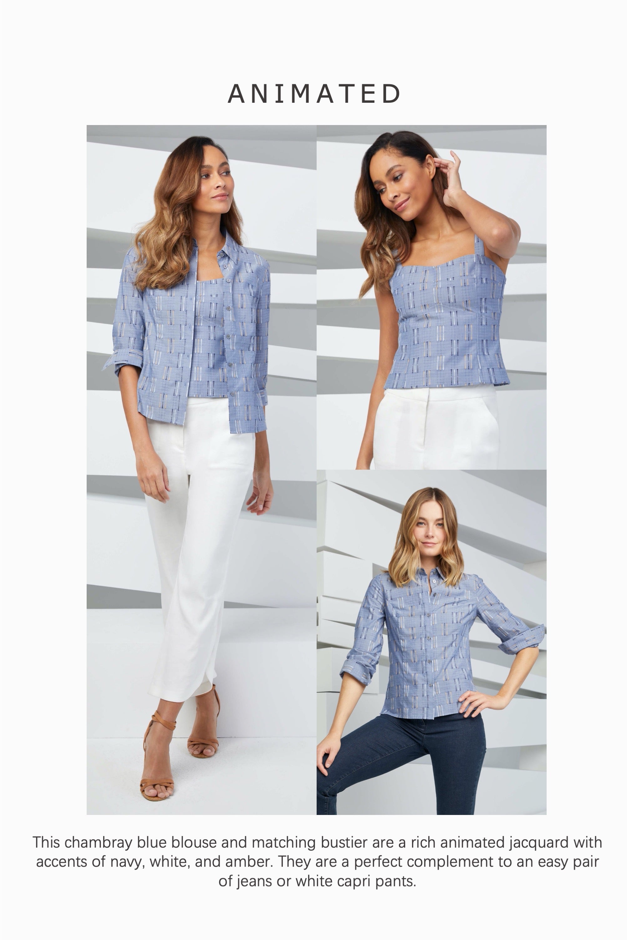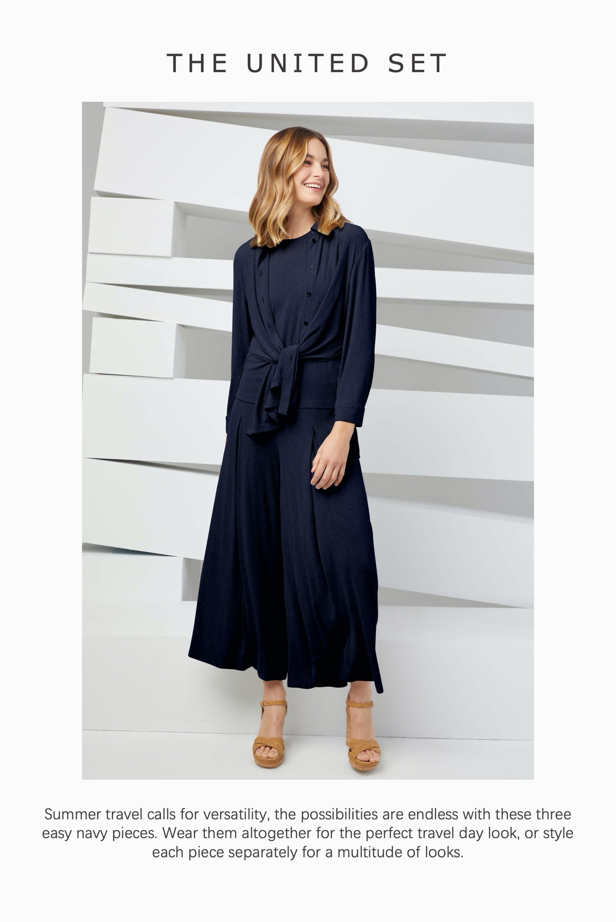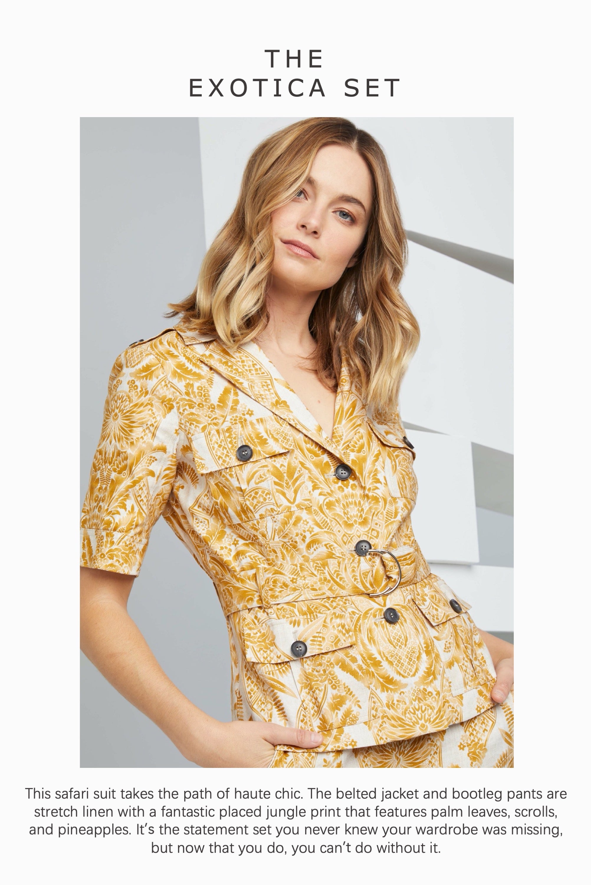 From the desert to the jungle, this season takes inspiration from the untamed wilderness. A giraffe inspires patterns in sophisticated clay and mulch shades that work together as a versatile neutral. The fleet and elegant gazelle influences the muted neutrals in fancy knits with streamlined stripes. The wild expanses of arid grasses and flowers of the Savanna inform the delicate embroidery and colors of mixable separates. Despite their wilderness source, all these pieces represent the height of urban sophistication.
