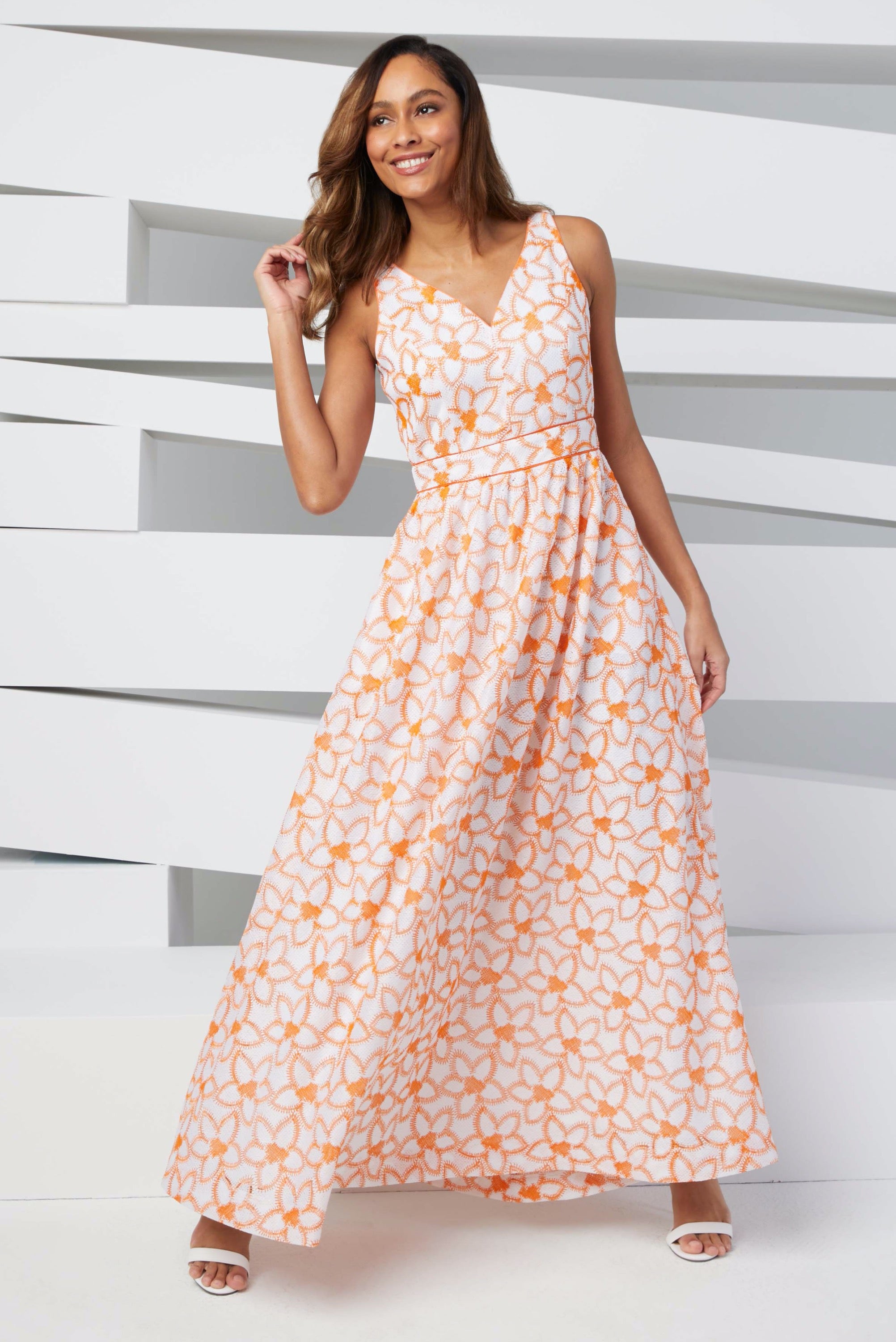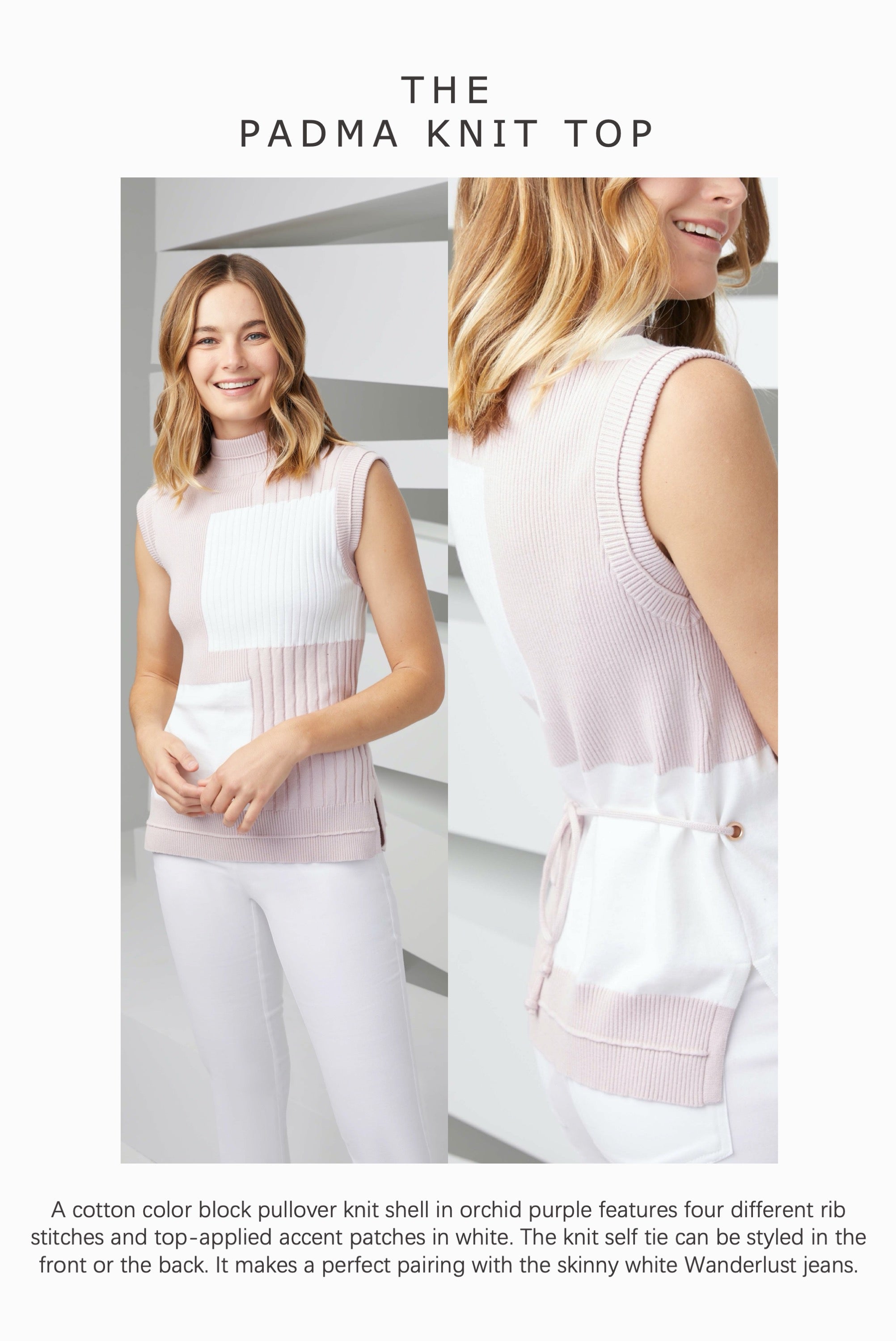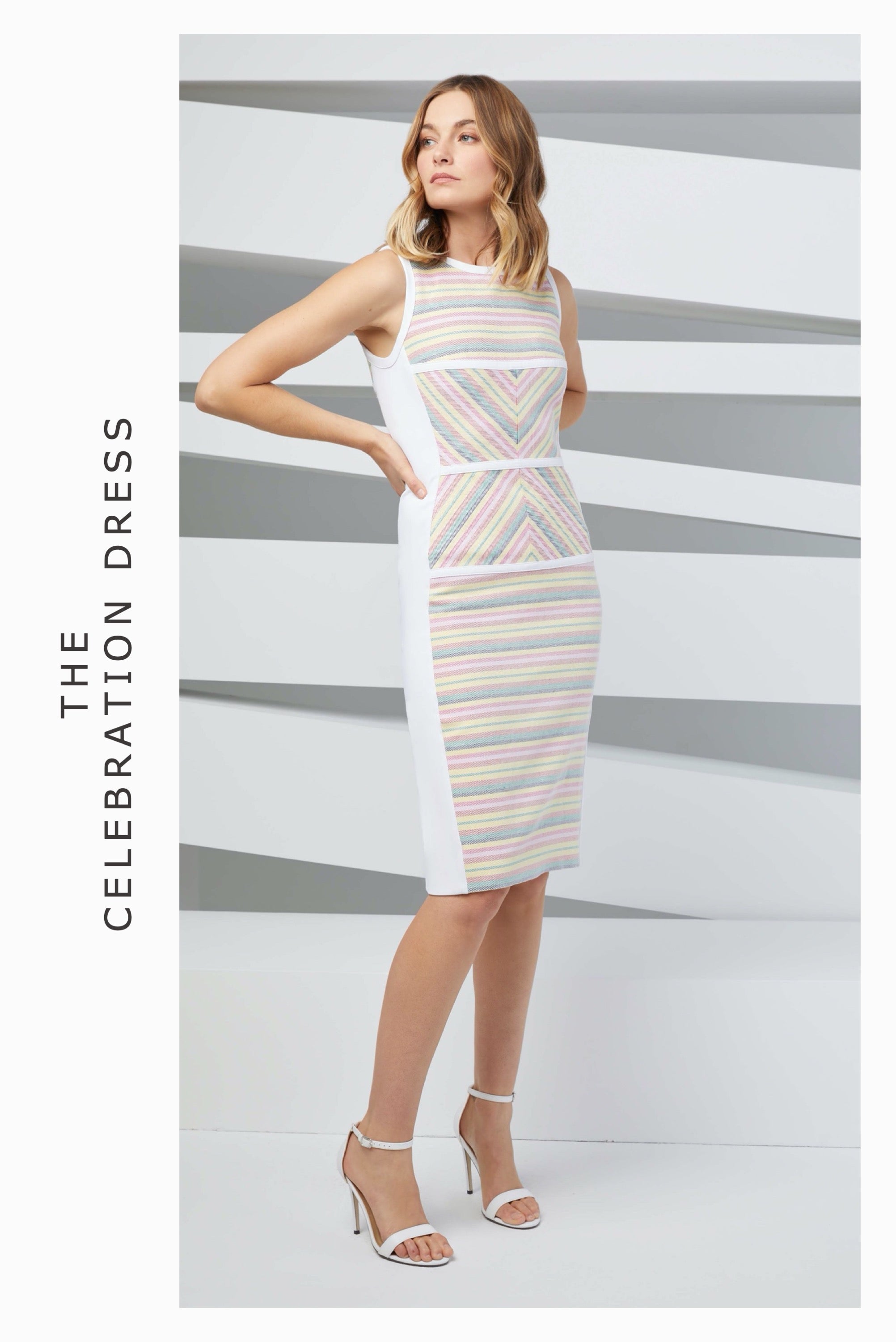 Bold patterns make a statement this season. A classic Greek key fashions the dress of the season in ultra-soft knit cotton with hand-crocheted trim and tassels. A multi-color placed mandala floral print adds color and hypnotic rhythm to a halter top and cocktail pants. Allover bronze metallic pineapples adorn the premier woven fil coupé halter sheath dress. Open black lace and white broderie anglaise add summer-perfect refinement to every pairing.