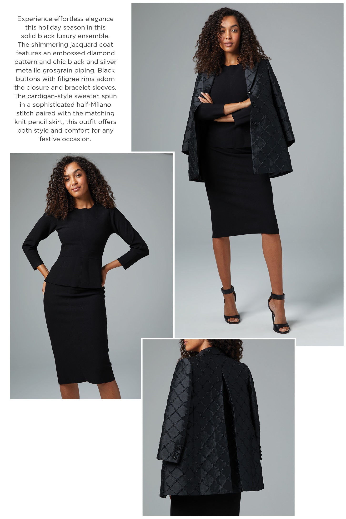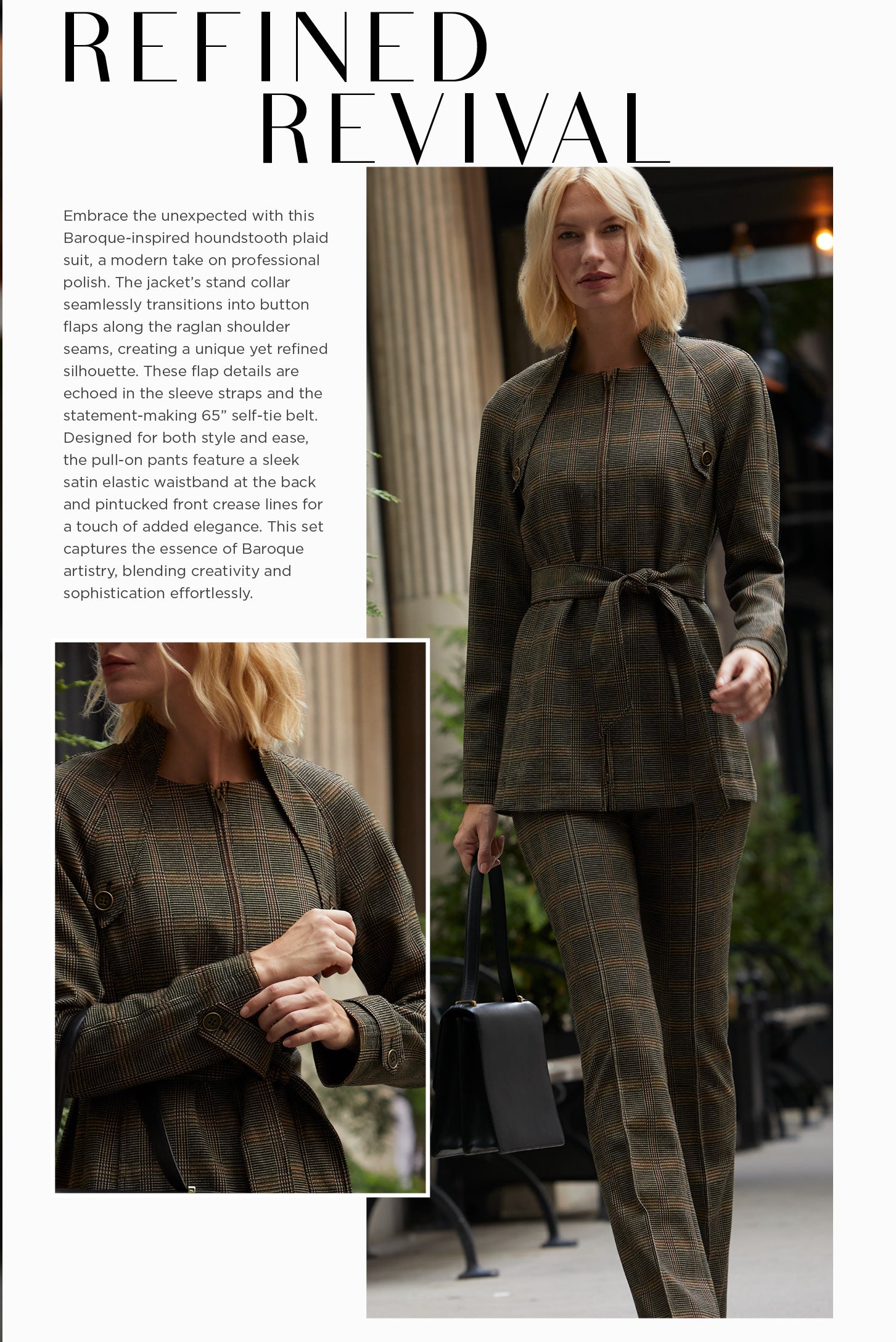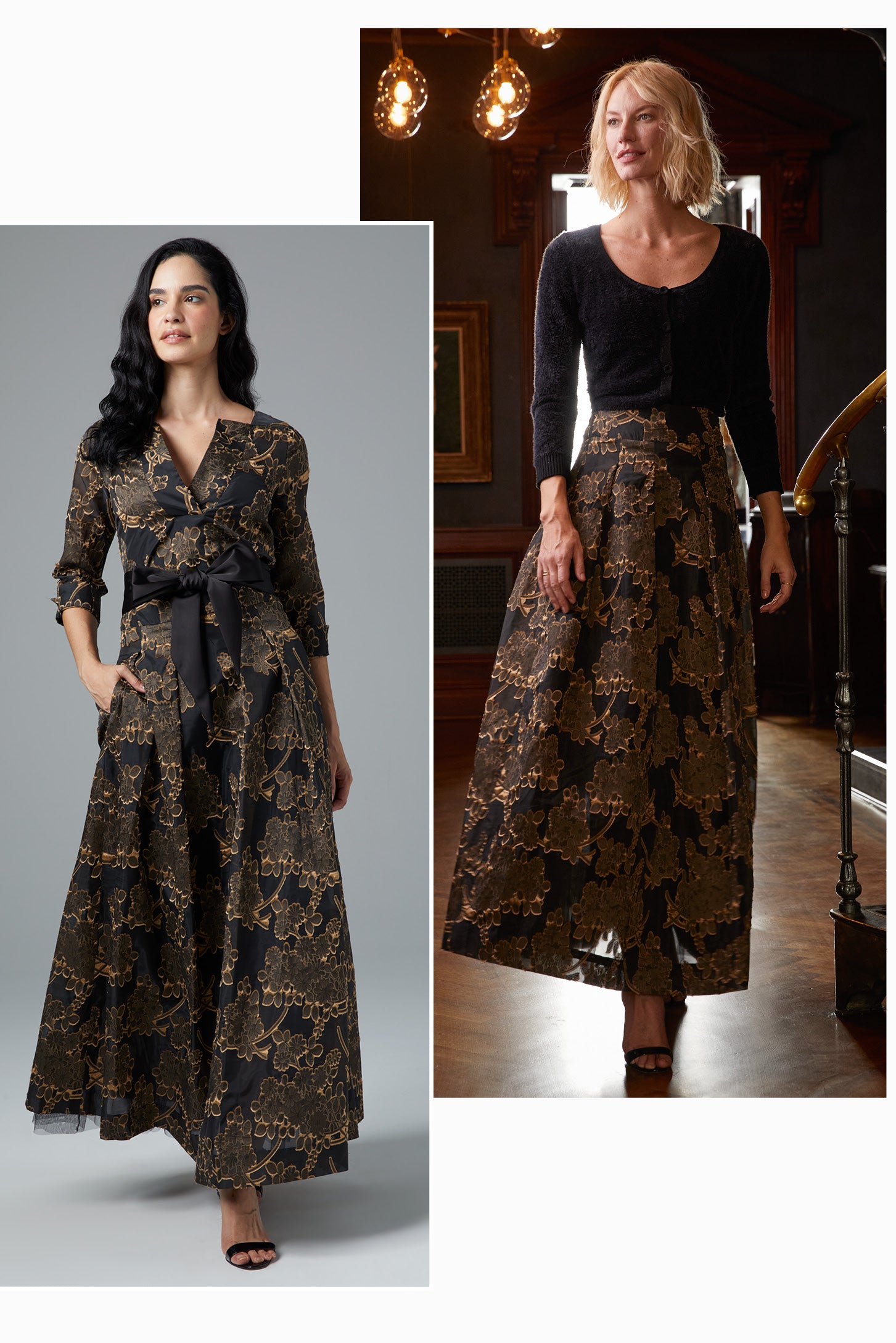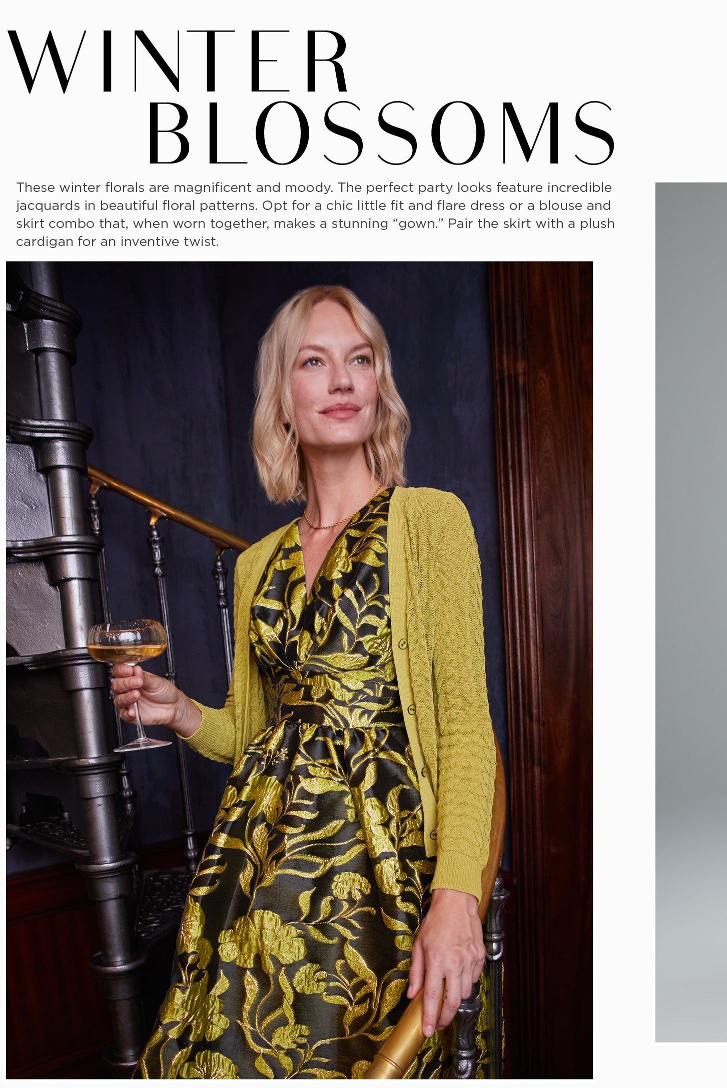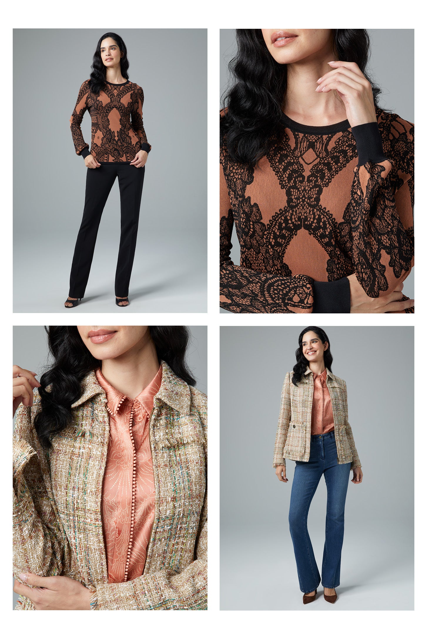 This Baroque Style capsule is a celebration of movement, texture, extravagance, and grandeur. Each piece is imbued with a sense of flow and richness, drawing inspiration from the Baroque era's dramatic aesthetic. The fringe of a gown with a hidden back panel takes flight at the slightest breeze. Chain prints and multi-scale knit cables create a sense of continuous motion, captivating the eye and adding depth to the garments. Painterly and floral prints bring romantic, artistic flair, while opulent brocade dresses and shimmering metallic print blouses embody luxurious elegance. The collection's multimedia metallic jackets and hand-applied appliqué flowers on party dresses showcase craftsmanship and attention to detail, merging historical grandeur with wearable fashion. Lace-look jacquard knits add refinement, channeling the intricate beauty of baroque textiles. Overall, this assortment is a masterful blend of texture, affluence, and drama, offering a modern interpretation of Baroque Style for today’s followers of fashion.