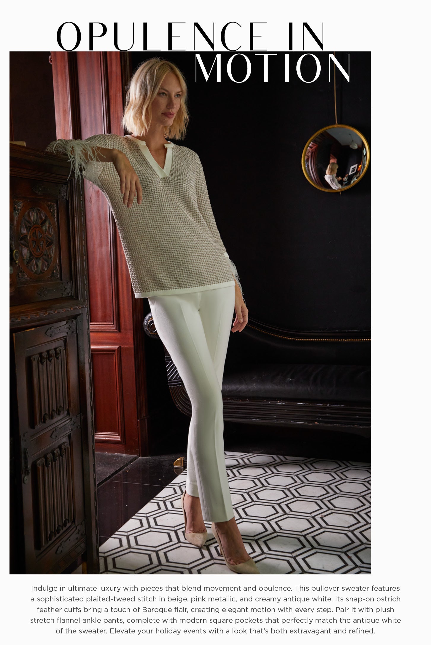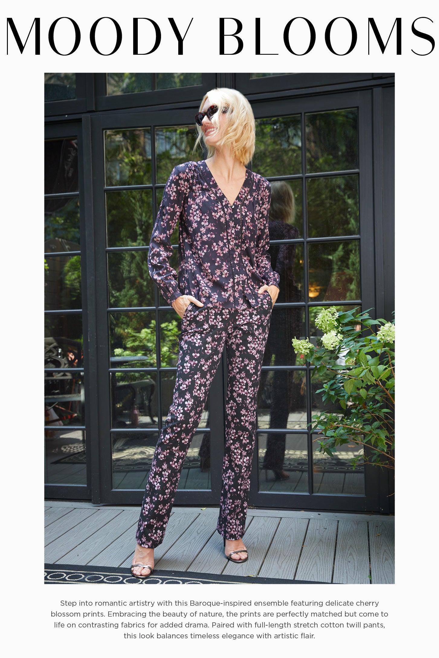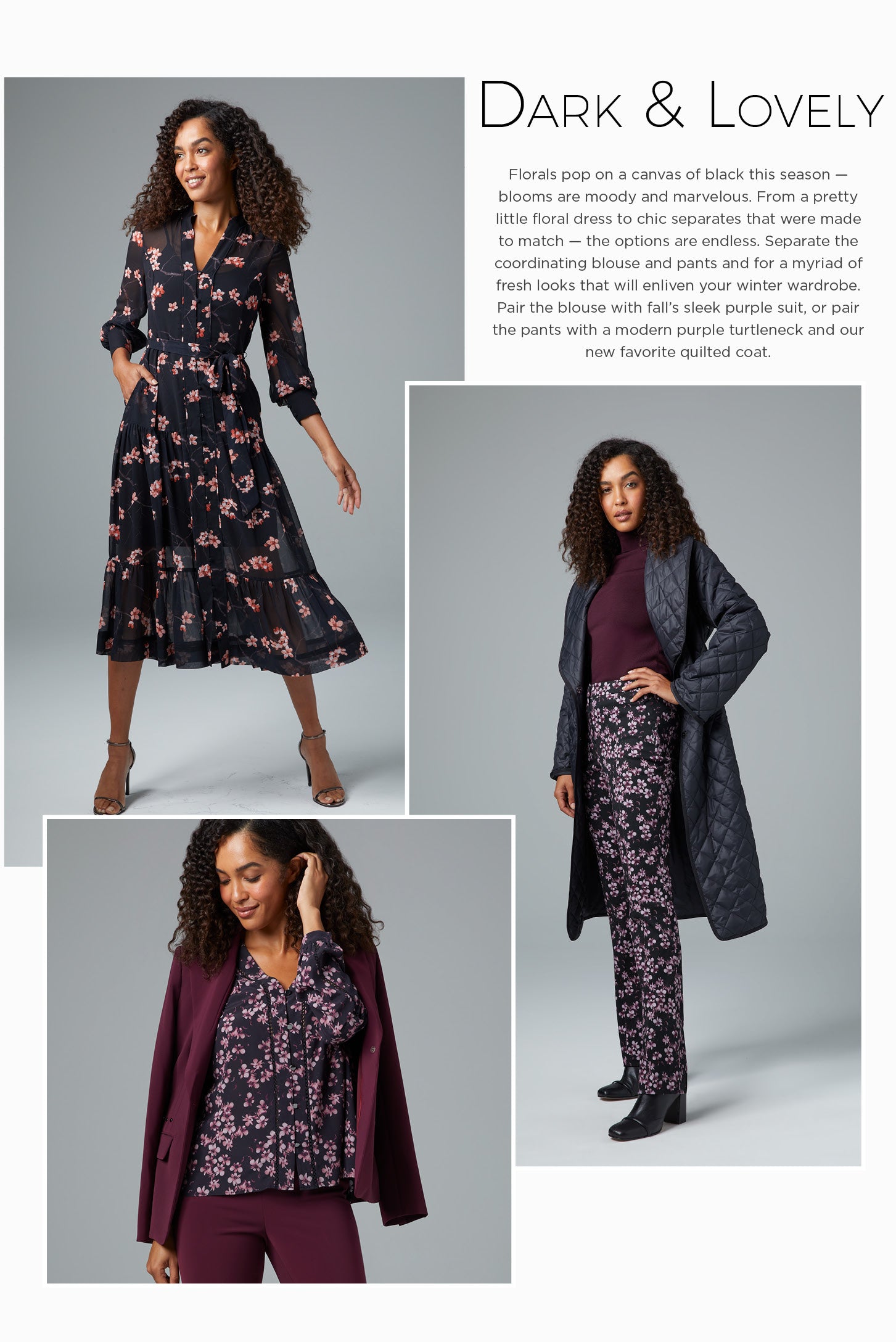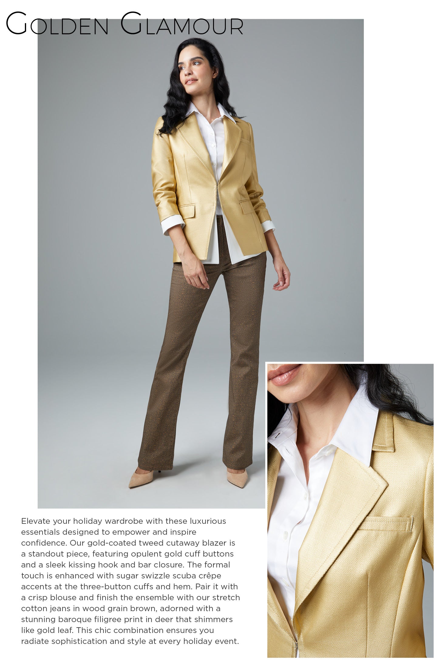 This Baroque Style capsule is a celebration of movement, texture, extravagance, and grandeur. Each piece is imbued with a sense of flow and richness, drawing inspiration from the Baroque era's dramatic aesthetic. The fringe of a gown with a hidden back panel takes flight at the slightest breeze. Chain prints and multi-scale knit cables create a sense of continuous motion, captivating the eye and adding depth to the garments. Painterly and floral prints bring romantic, artistic flair, while opulent brocade dresses and shimmering metallic print blouses embody luxurious elegance. The collection's multimedia metallic jackets and hand-applied appliqué flowers on party dresses showcase craftsmanship and attention to detail, merging historical grandeur with wearable fashion. Lace-look jacquard knits add refinement, channeling the intricate beauty of baroque textiles. Overall, this assortment is a masterful blend of texture, affluence, and drama, offering a modern interpretation of Baroque Style for today’s followers of fashion.