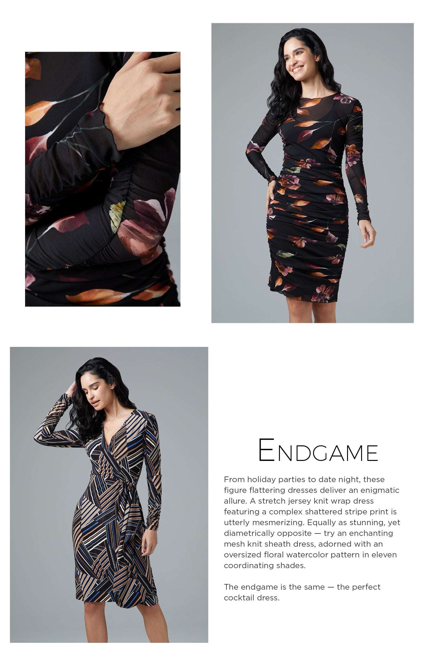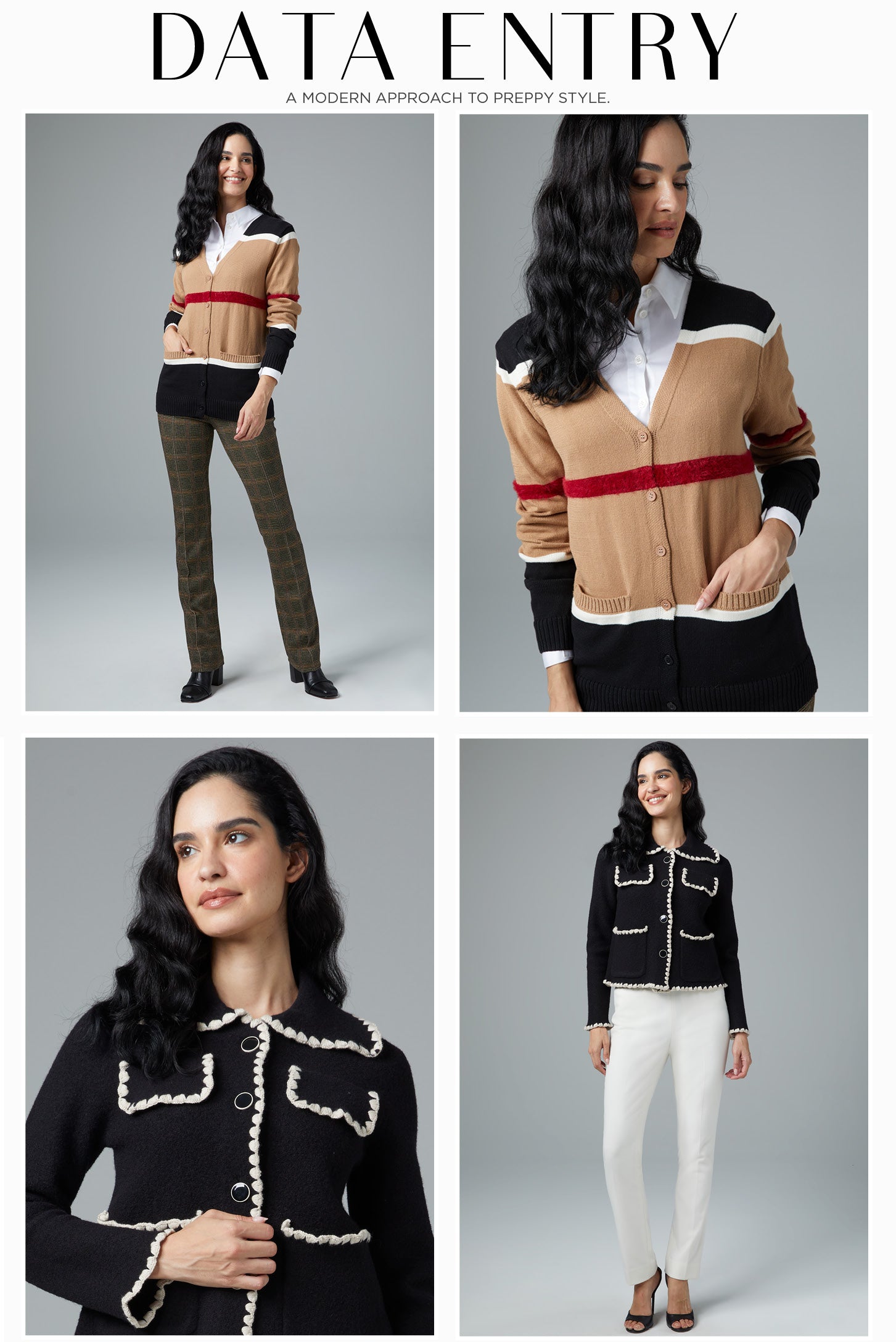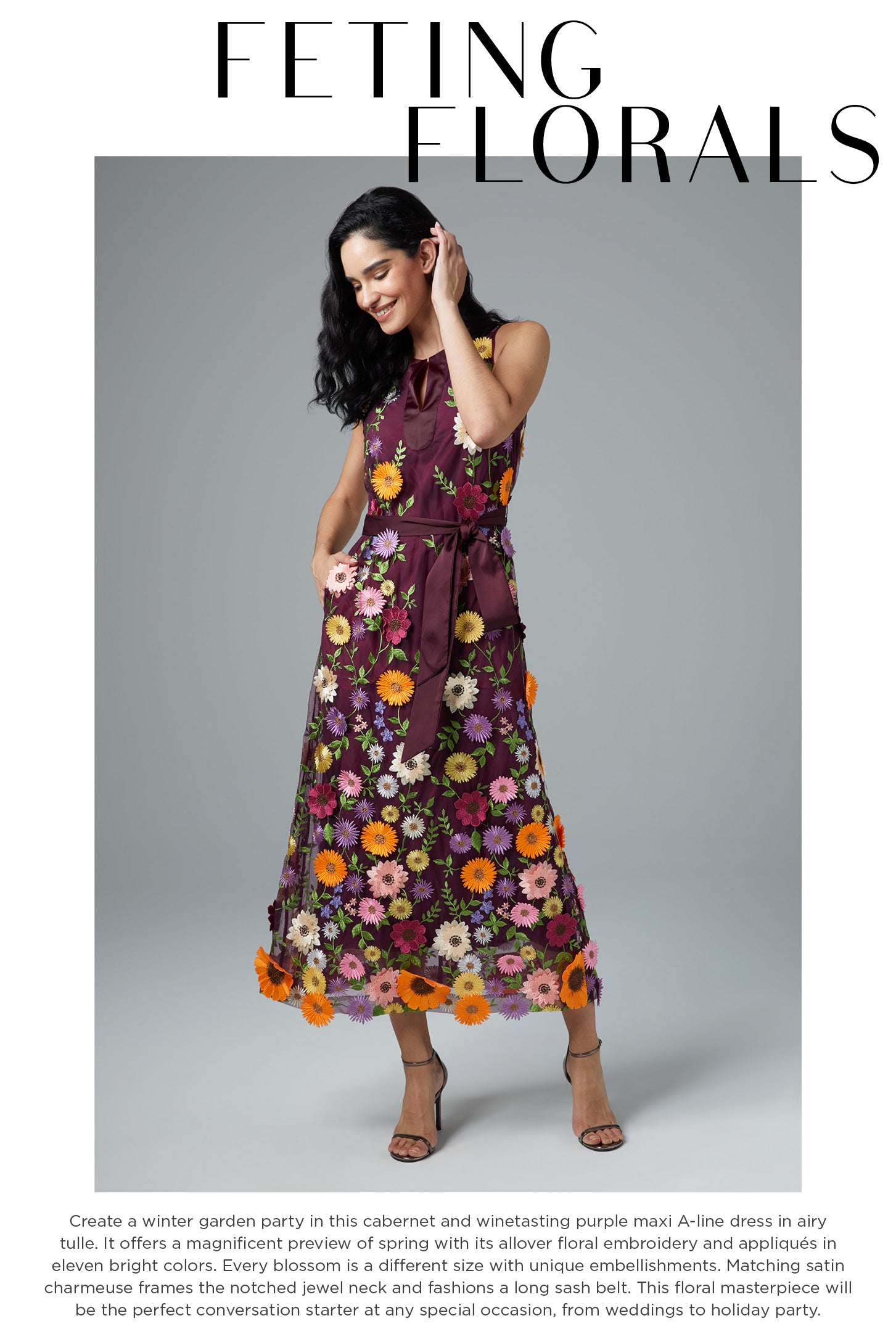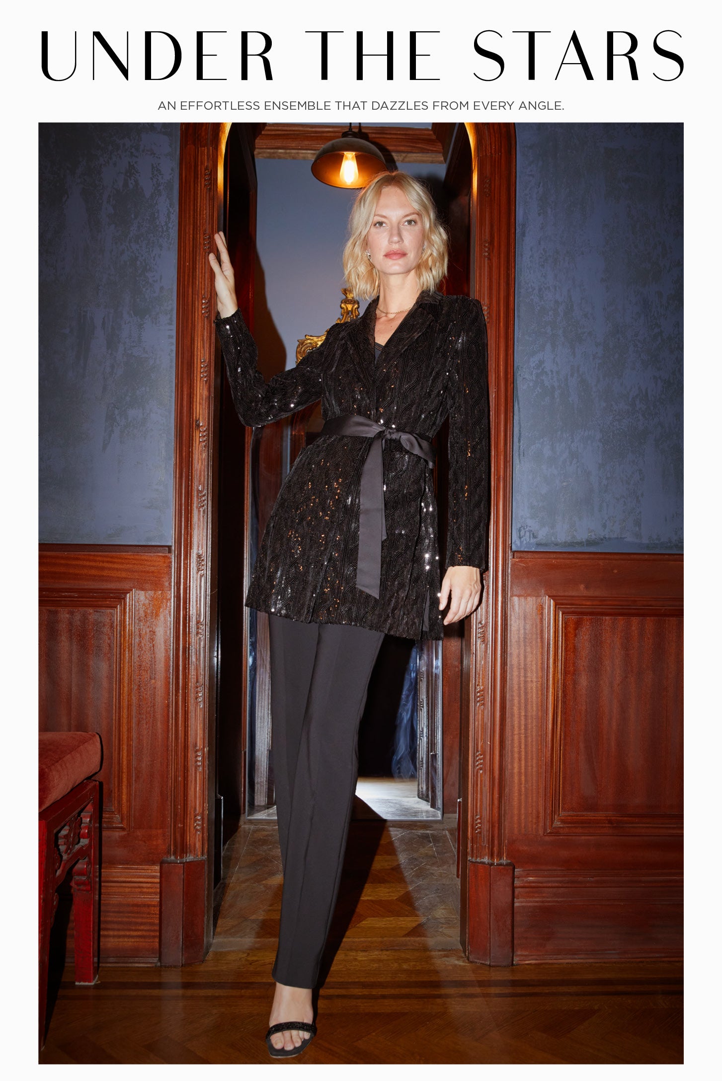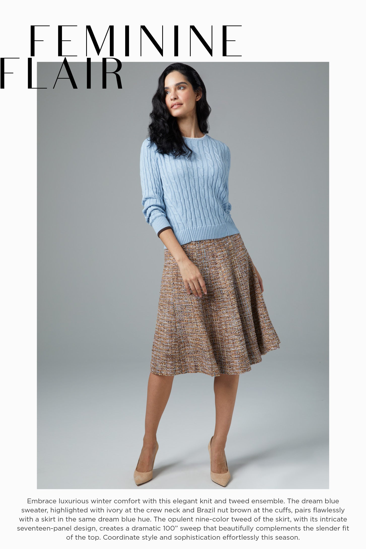 This Baroque Style capsule is a celebration of movement, texture, extravagance, and grandeur. Each piece is imbued with a sense of flow and richness, drawing inspiration from the Baroque era's dramatic aesthetic. The fringe of a gown with a hidden back panel takes flight at the slightest breeze. Chain prints and multi-scale knit cables create a sense of continuous motion, captivating the eye and adding depth to the garments. Painterly and floral prints bring romantic, artistic flair, while opulent brocade dresses and shimmering metallic print blouses embody luxurious elegance. The collection's multimedia metallic jackets and hand-applied appliqué flowers on party dresses showcase craftsmanship and attention to detail, merging historical grandeur with wearable fashion. Lace-look jacquard knits add refinement, channeling the intricate beauty of baroque textiles. Overall, this assortment is a masterful blend of texture, affluence, and drama, offering a modern interpretation of Baroque Style for today’s followers of fashion.