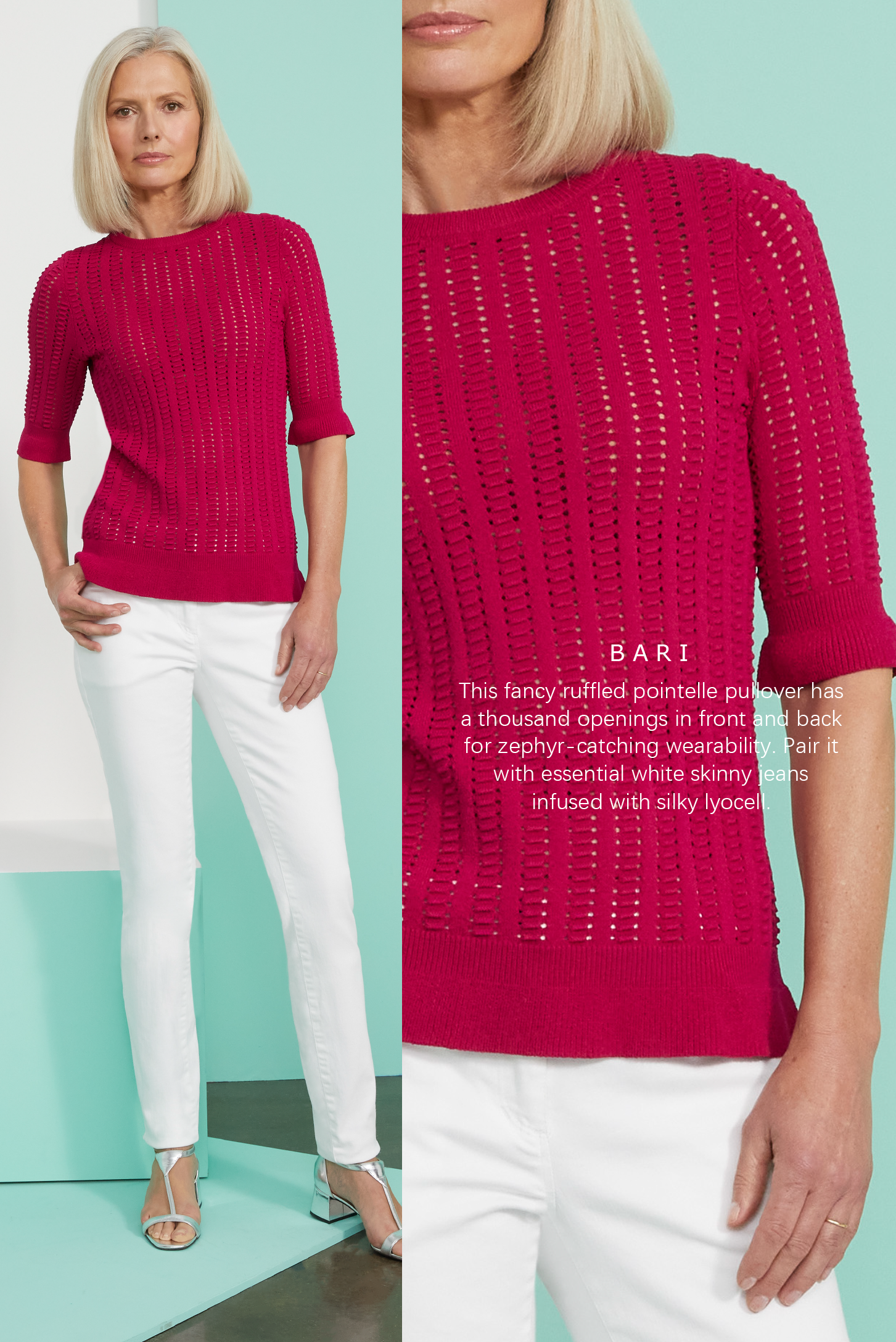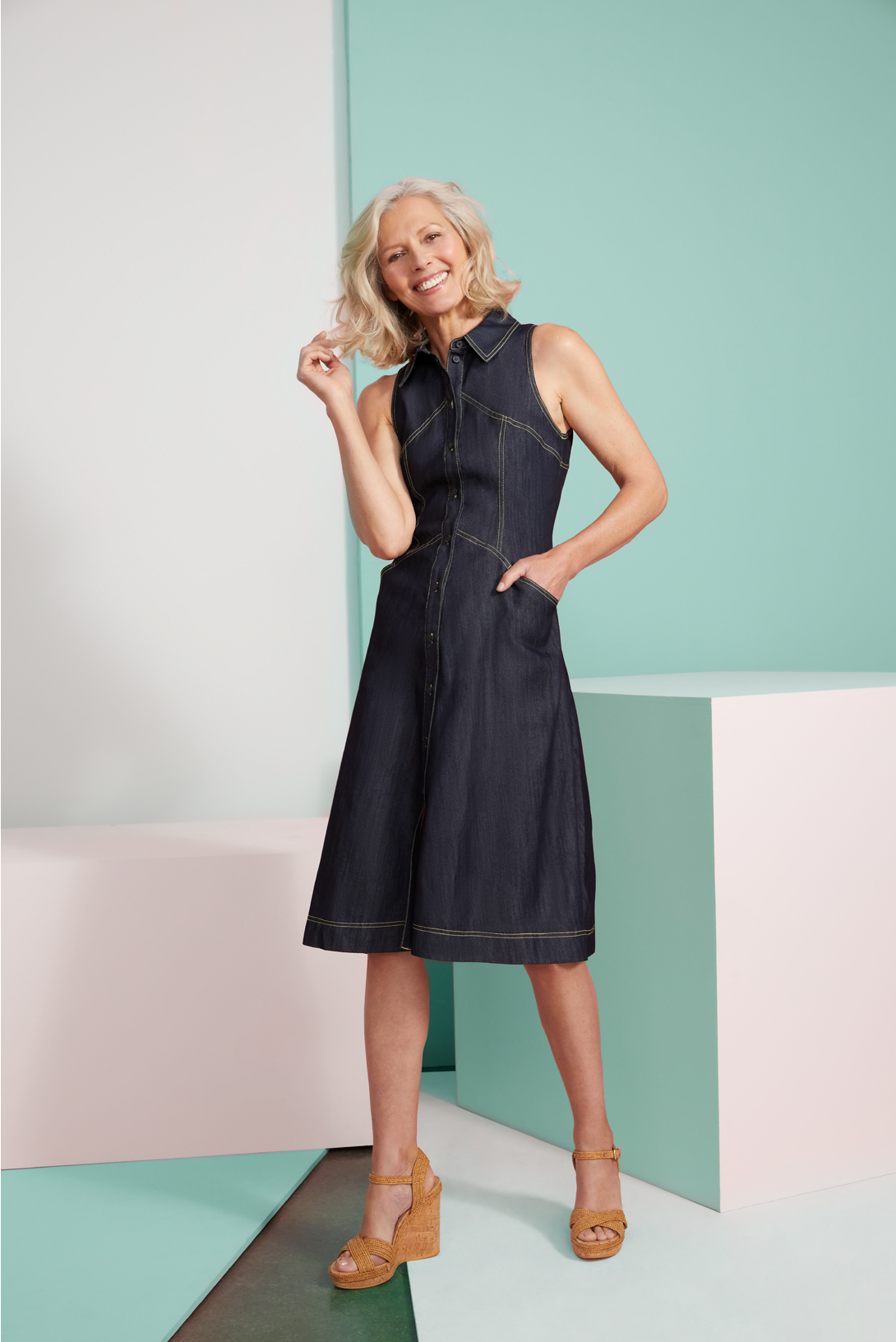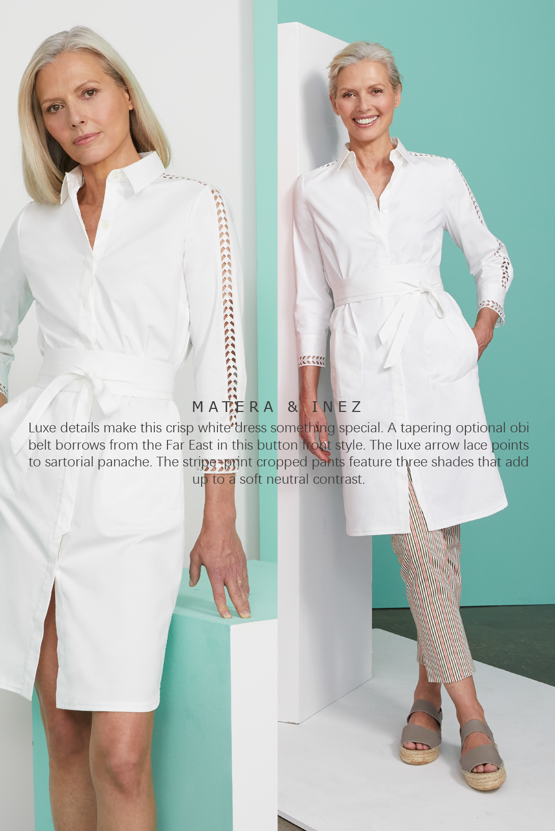 Easy casual styles in muted shades are a sure thing for fabulous photo ops. The limited palette is counterbalanced by a variety of rich textures. Airy gauze, Italian dot jacquard, denim jacquard, ladder-stitch embroidery, plus silky jersey, and tuck-stitch knitwear reinforce a nature-loving ethos. Blossoms pattern jacquard jeans in three cool shades. An Italian crinkle chiffon halter and skirt in a complex millefiori print express the indigenous glass industry of the Veneto.